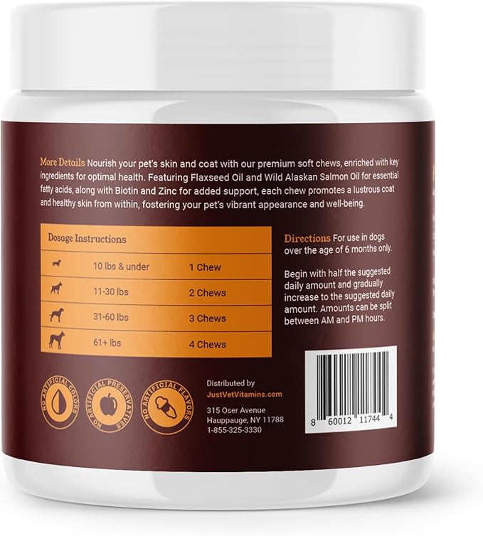 Skin & Coat Chews for Dogs with Flaxseed Oil, Wild Alaskan Salmon Oil, Biotin, and Zinc – Supports Healthy Skin and Shiny Fur – 90 Soft Chews