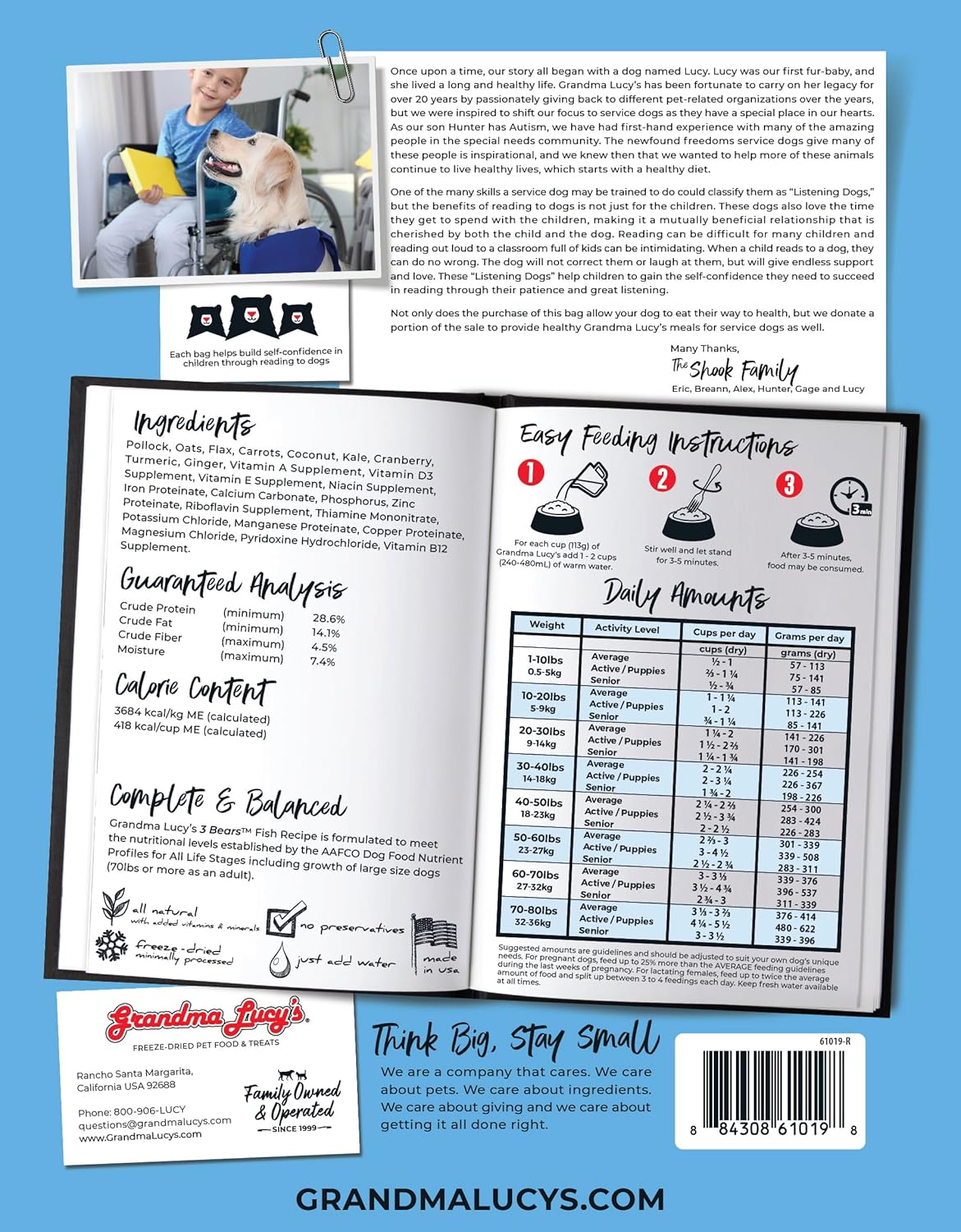 - Grandma Lucy's is proudly Family Owned and Operated and dedicated to giving back for over 25 years. Each bag of 3 Bears Recipe sold helps build self-confidence in children through reading to dogs.
