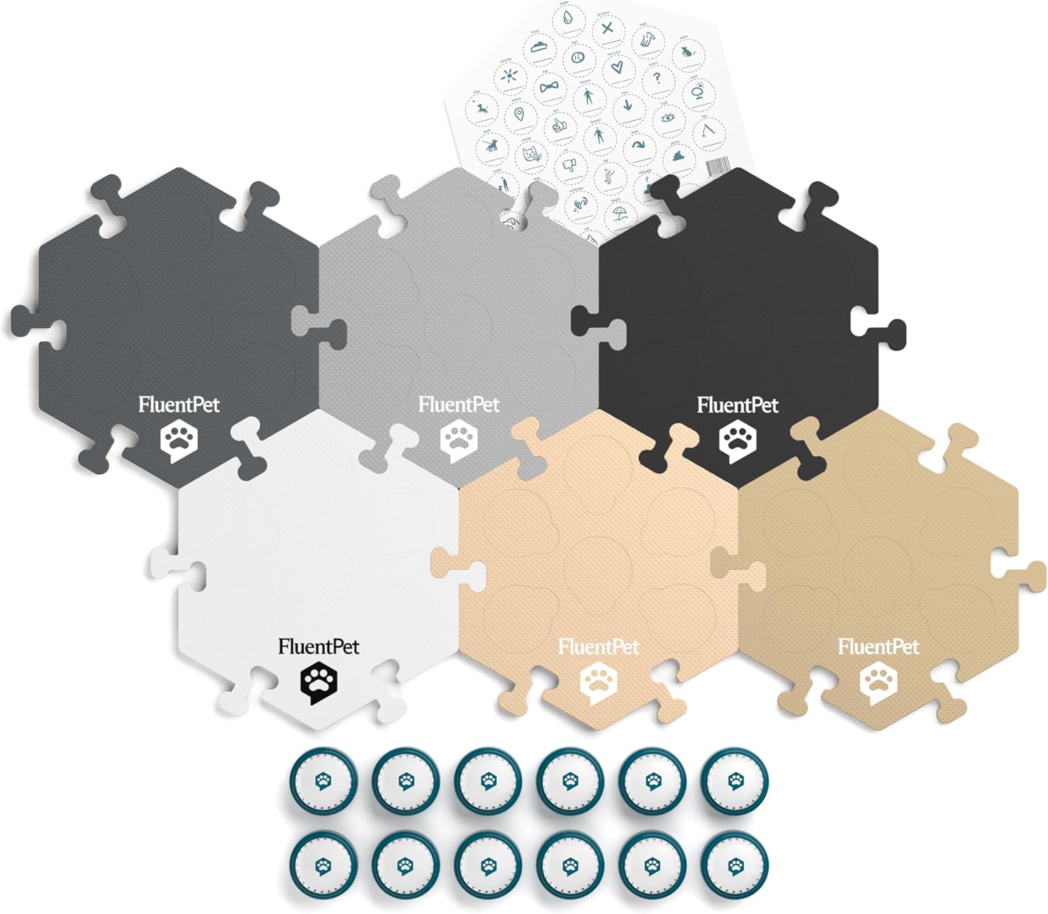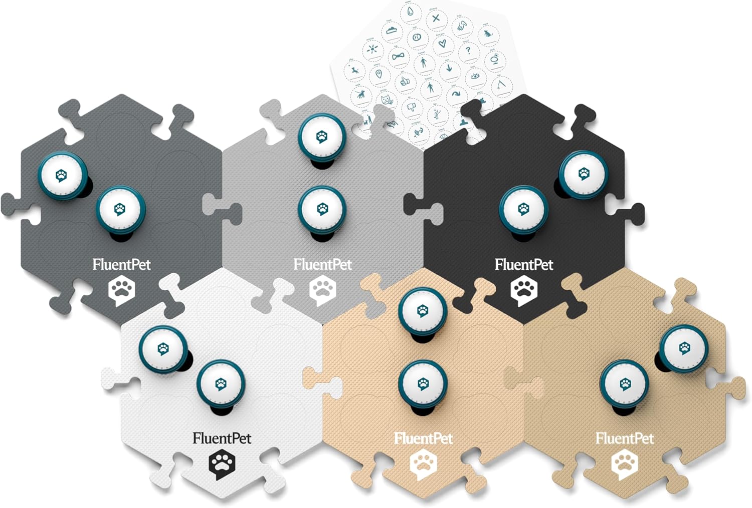 - 【 FROM BARKS & MEOWS TO WORDS 】: With the FluentPet Speak Up! Get Started Kit, you can teach your dog or cat to express their needs and feelings. This complete set includes 12 premium recordable buttons, 6 HexTile mats, 35 customizable stickers, and pre-installed batteries for instant use. Delivers loud, clear, upward-facing sound to help “fluent pets” learn faster and build a richer vocabulary.