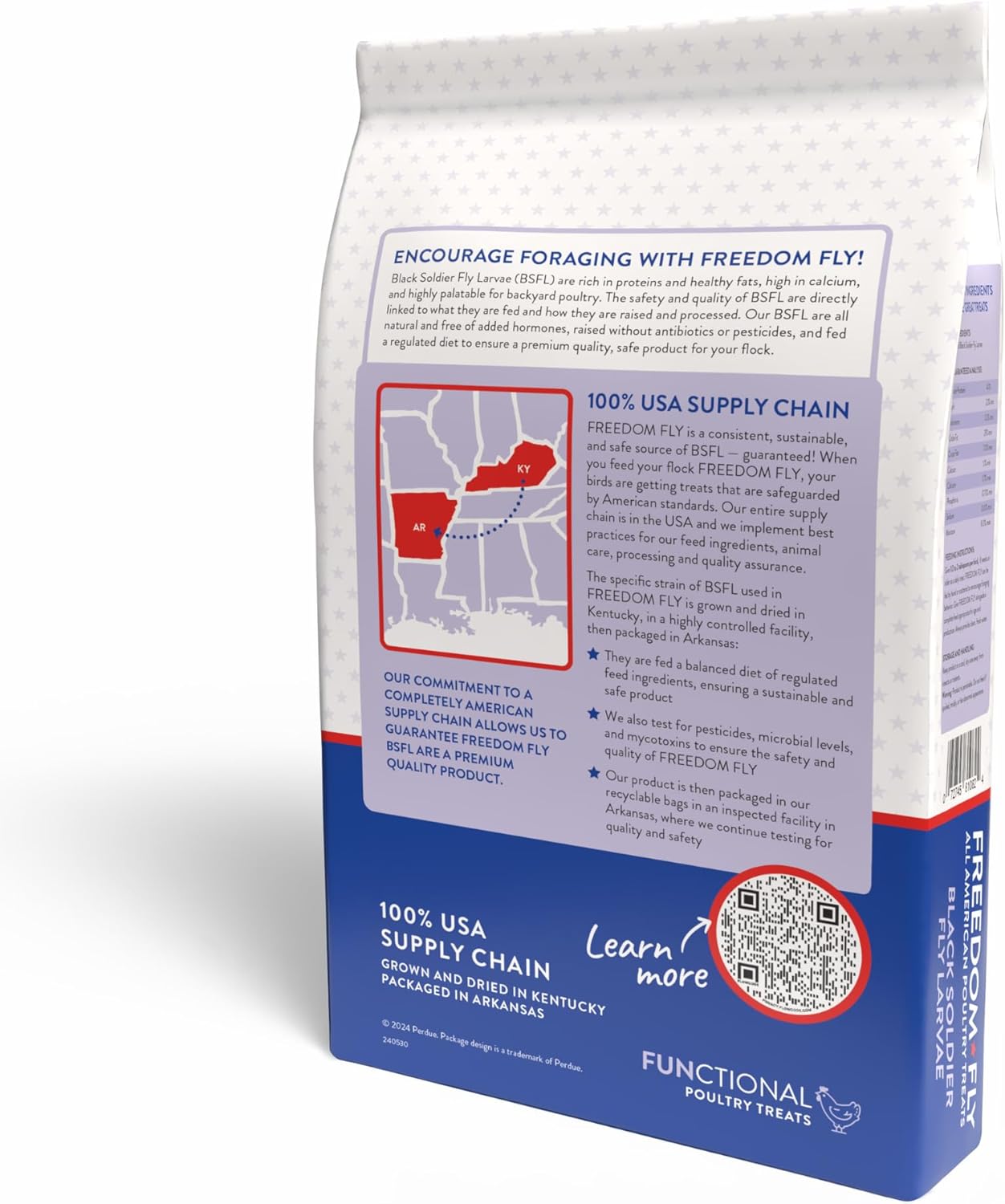 - 100% USA SUPPLY CHAIN: Most backyard chicken owners demand more transparency about the safety, quality, and sustainability of the black soldier fly larvae that their flocks are eating. FREEDOM FLY is grown and dried in Kentucky and packaged in Arkansas in routinely inspected facilities compliant with the standards established by the US Food Safety Modernization Act (FSMA).