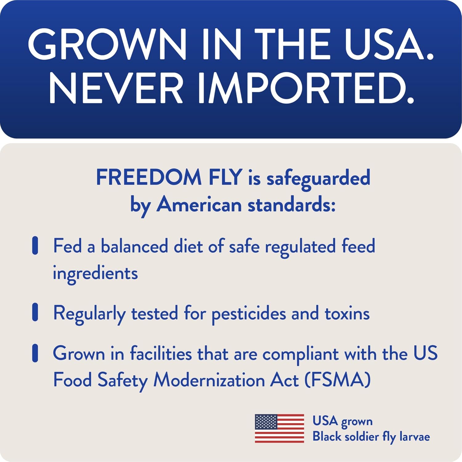 - 100% USA SUPPLY CHAIN: Most backyard chicken owners demand more transparency about the safety, quality, and sustainability of the black soldier fly larvae that their flocks are eating. FREEDOM FLY is grown and dried in Kentucky and packaged in Arkansas in routinely inspected facilities compliant with the standards established by the US Food Safety Modernization Act (FSMA).