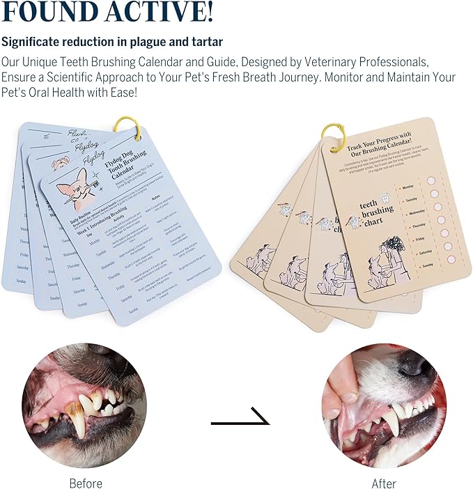 - 🐾 Build Healthy Habits 🐾 — Includes a 360° toothbrush and finger brush to fit different dog sizes and oral areas. Comes with a step-by-step brushing guide, and a calendar to help owners establish scientific routines and track progress long-term.