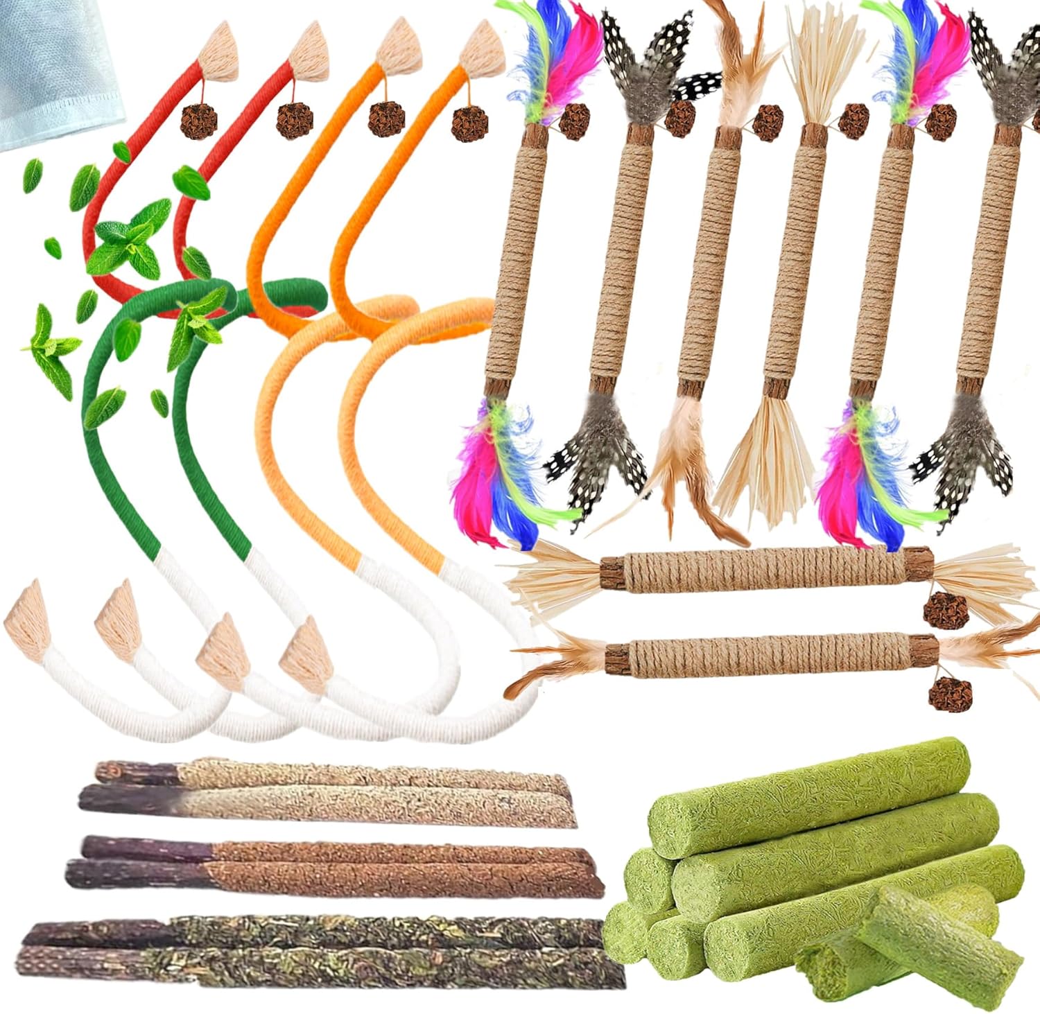- Mixed Cat Rope Cat Stick Cat Grass: Mixed Cat toys for meet all indoor kitten needs included: 1 x catnip bag + 4 x 23.6” cat catnip rope toys + 8*cat silvervine with lafite grass or feather +6* Cat grass sticks+ 6* cat silvervine coating sticks. Cat toys for indoor cats is suitable for cats of all ages & breeds, relaxation for every stage of life. No wire inside, safe to use.