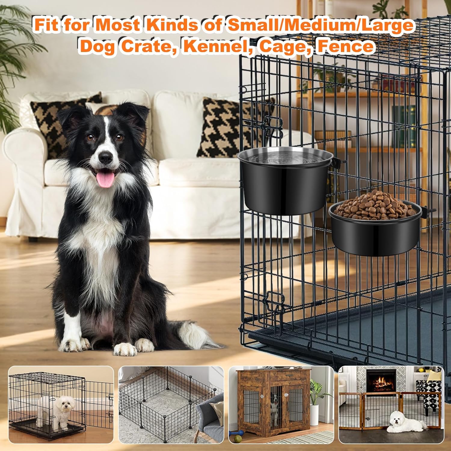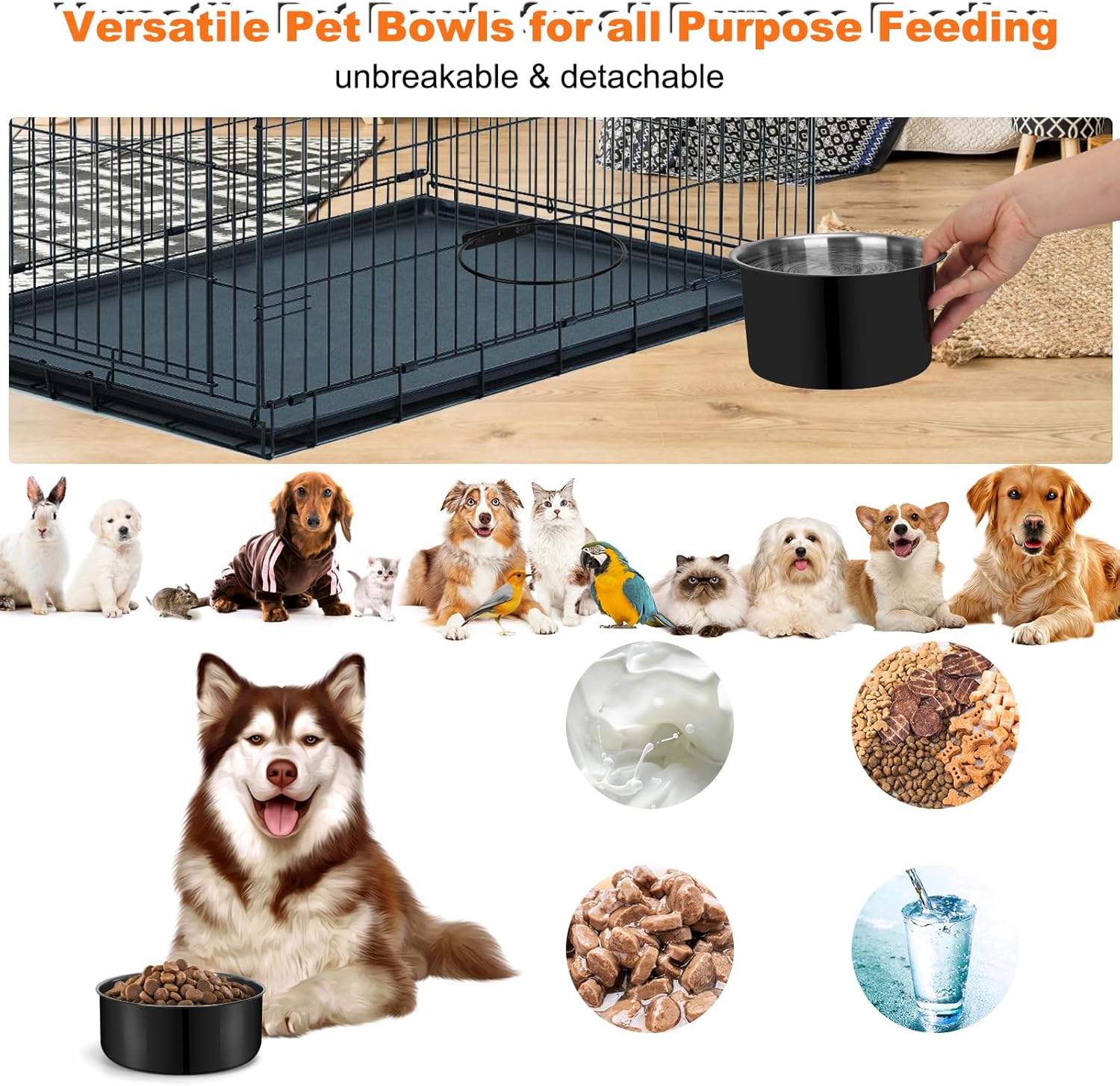 - Stable and Secure on Crate: Made of premium stainless steel, the dog bowl set is durable to last indefinitely even your pet is a chewer. The metal dog bowl fit snugly into the place supported by the ring to avoid spilling over to keep the kennel clean. The whole set is thick, heavy duty for medium and large destructive dogs.
