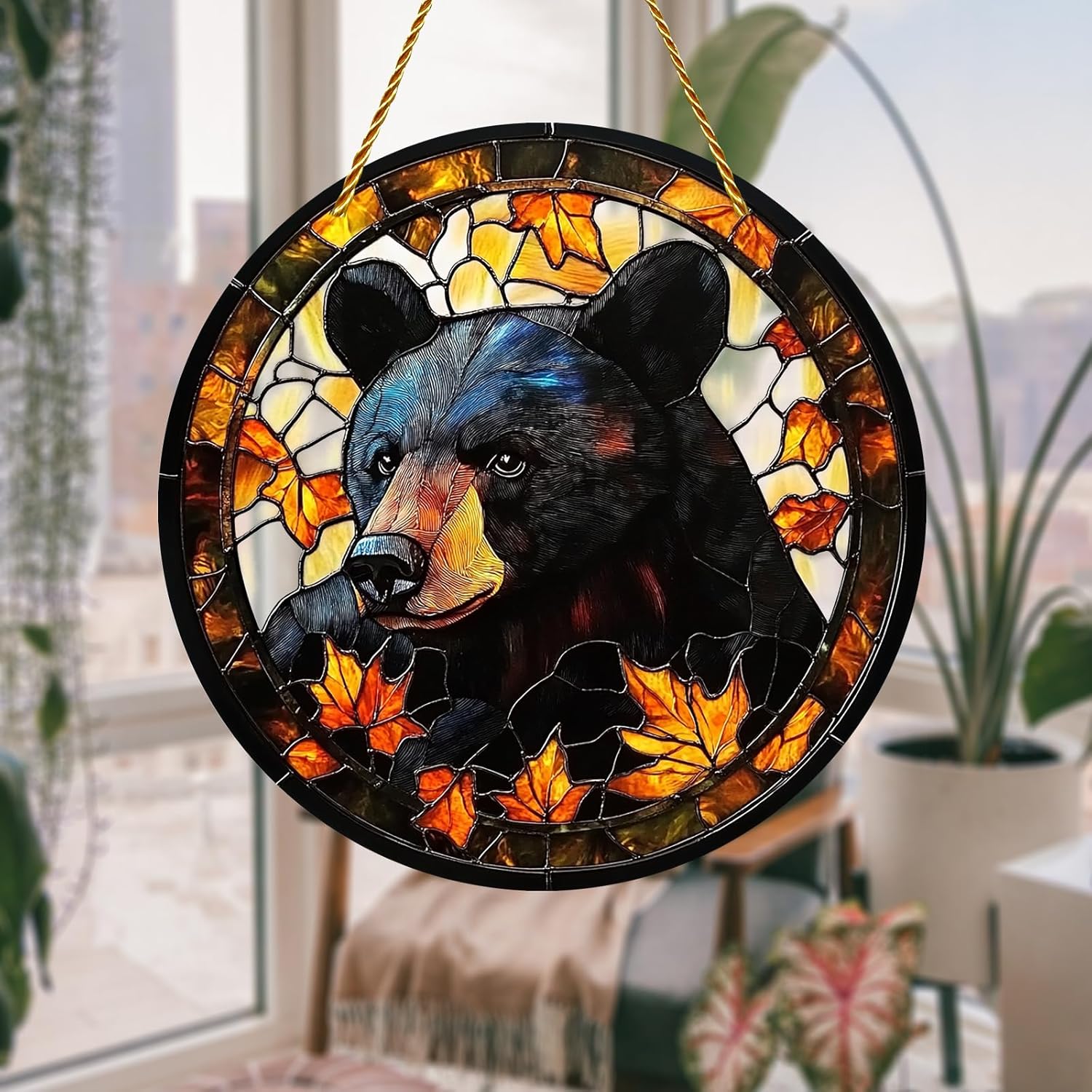 8x8 inch Charming Black Bear Autumn Acrylic Stained Glass Window Hanging Sun Catcher Decor Stained Panel Hangings Wall Art Decor, for Friends and Family (Black Bear)