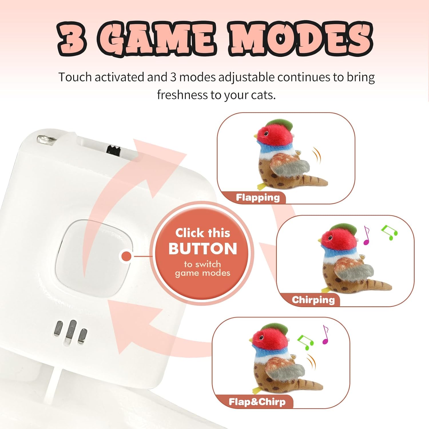 - Interactive Cat Toys:Whenever your kitten touches or slaps this cat toy, the built-in automatic motion sensor will be activated, and the cute pheasant will flapping its wings and chirping, thus attracting your cat to interact and play with it