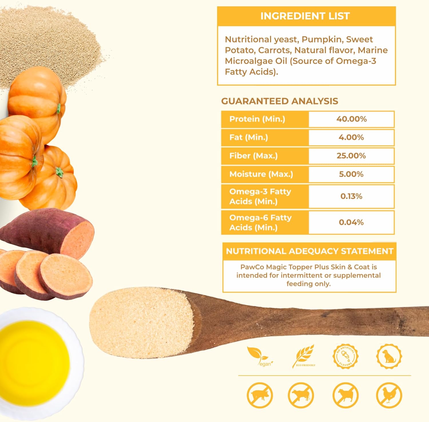 - Vegan & Grain-Free: A dog topper for skin and coat that’s free of grains and common allergens and made with natural, plant-based ingredients.