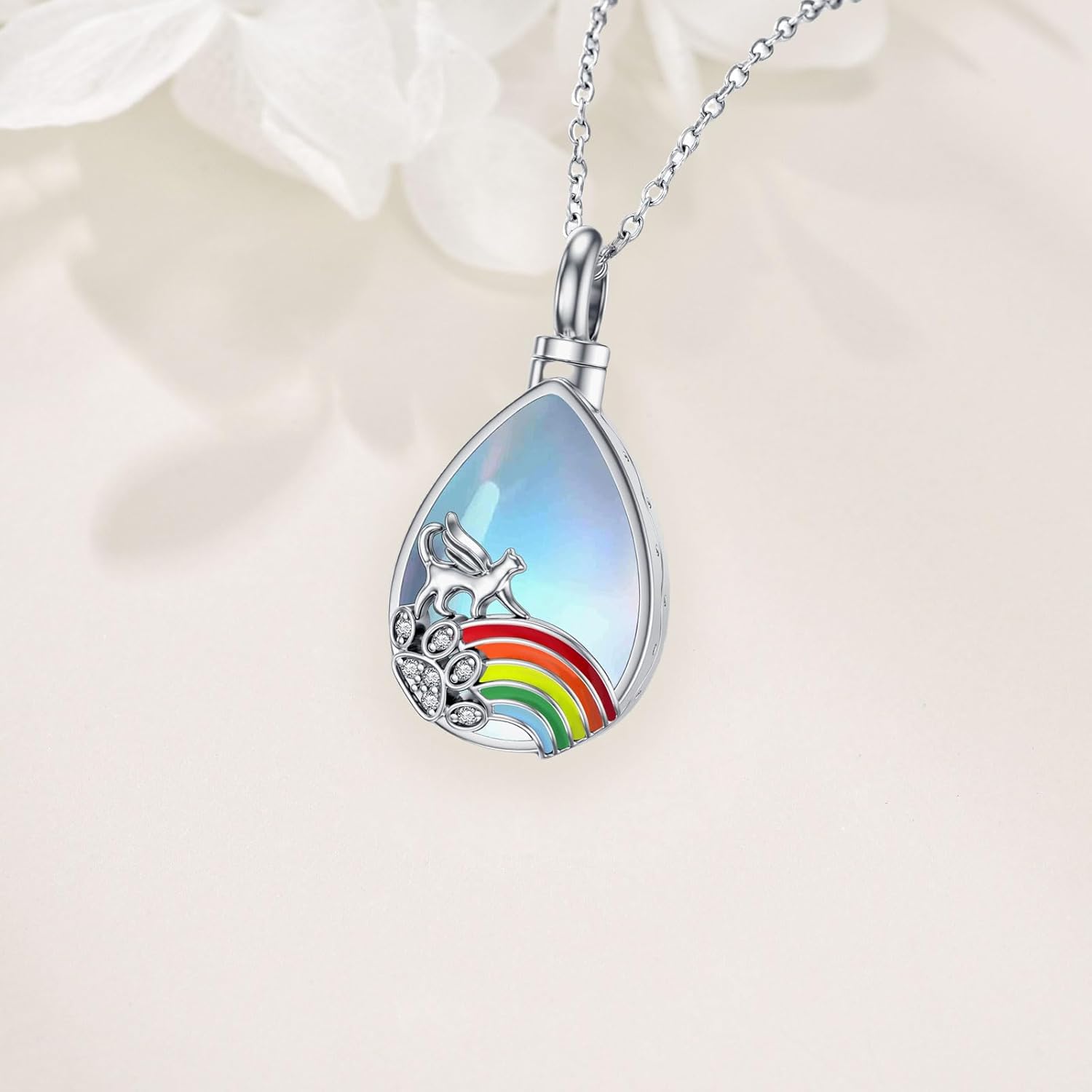 - 【Rainbow Bridge Cat Urn Necklace】 Rainbow Bridge Cat Urn Necklace, featuring a delicate created moonstone teardrop pendant, designed with a lovely winged angel walking on a striking rainbow bridge. Dedicated those cherished angels who have crossed the rainbow bridge