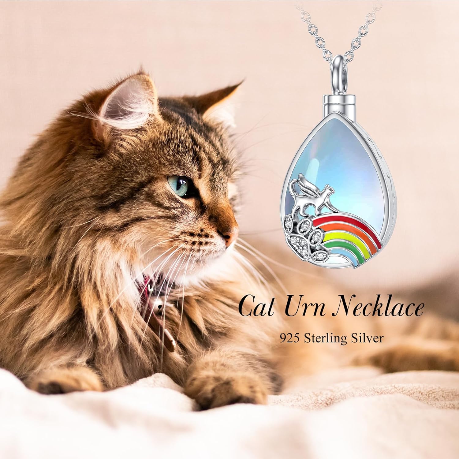 - 【Sterling Silver Urn Pendant Necklace for Ashes】 Rainbow bridge cat ashes pendant necklace is made of real 925 sterling silver. Chain:18"+2"(Extend Chain); Packaging: 1xCat Urn Necklaces jewelry, 1xpolishing cloth, 1xFilling Kit for you to fill the memories in and 1 x exquisite gift box. Rainbow bridge cat necklace as a gentle reminder of the love that transcends the gap between this world and the next