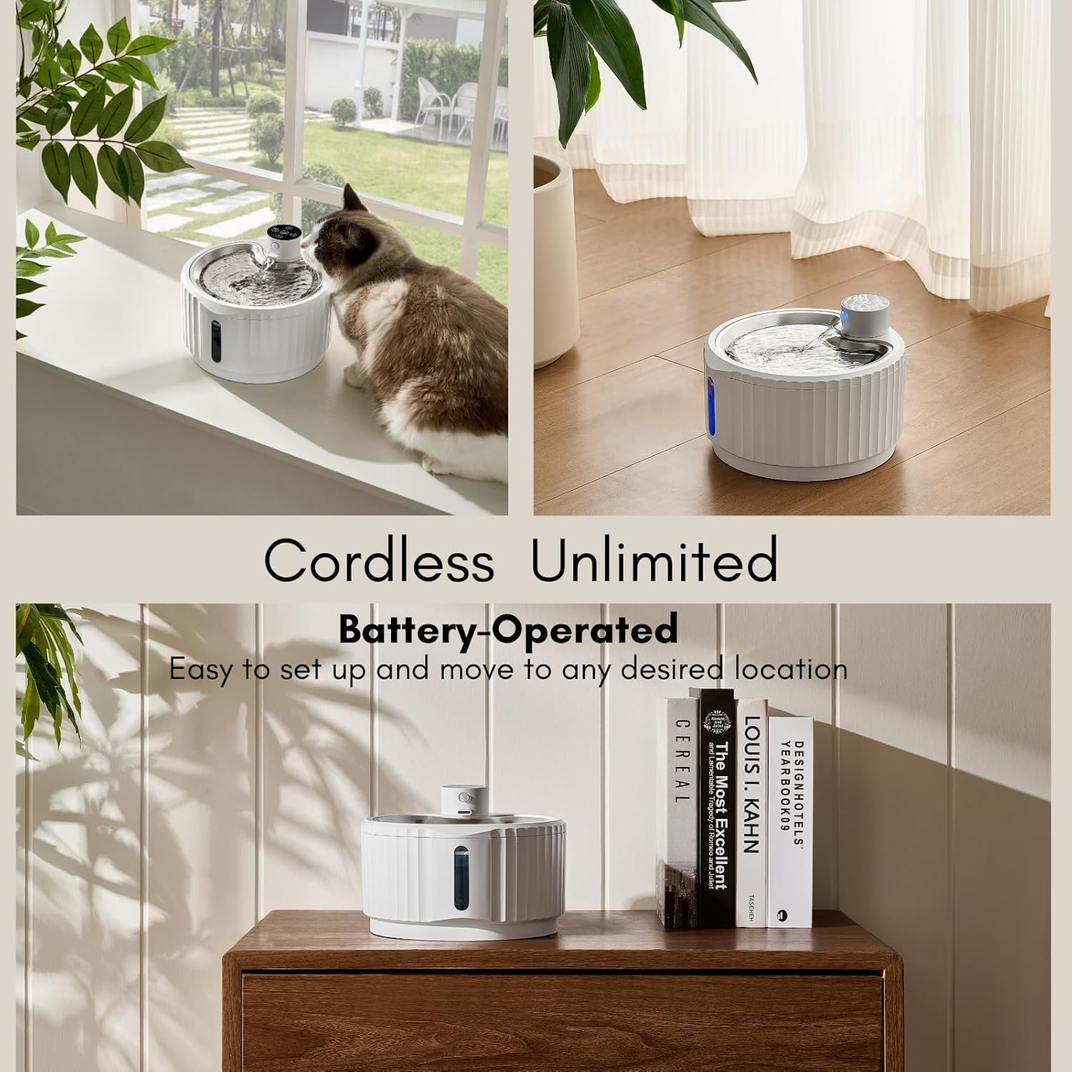 - Portable Design: The cat water fountain operates on battery power without cords, which allows for flexible placement in your pet's preferred areas to promote increased water intake for your pet. It's also safe from wire-related accidents and chew hazards