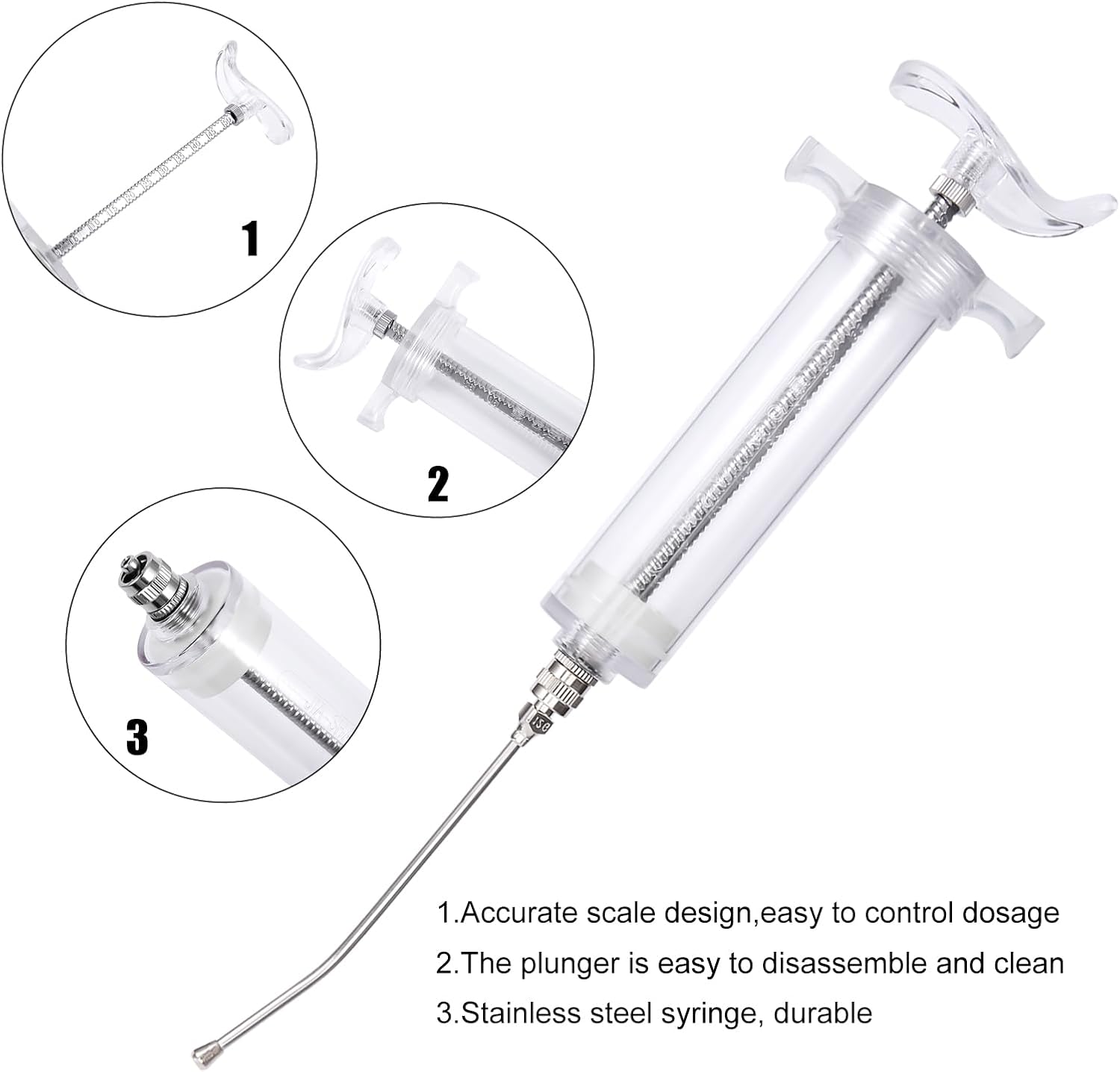 - Material:Stainless and plastic,steel syringes with easily removable plunger.Light weight, simple structure, easy to clean, not easy to break