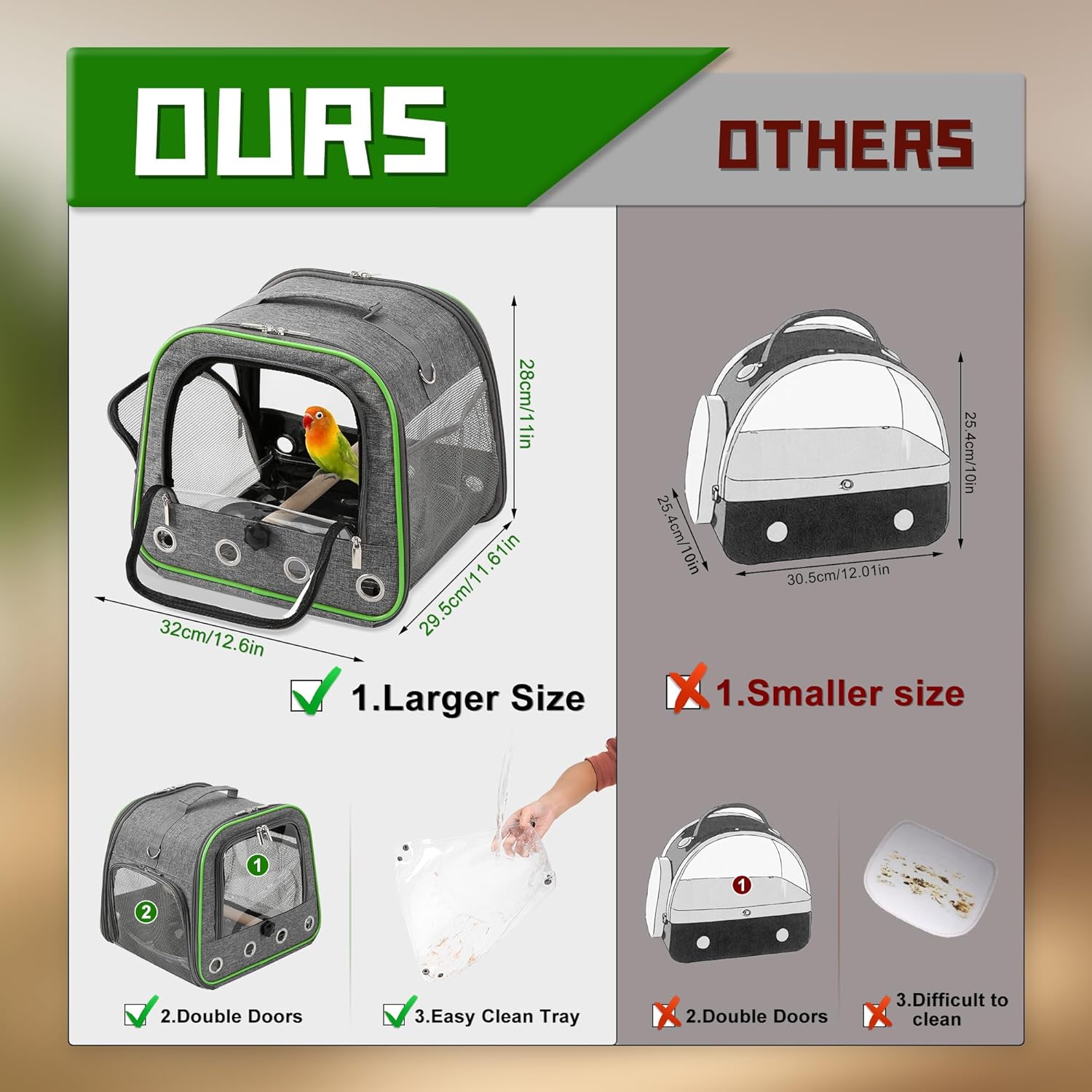 - 【Size and Service】 12.6"L x 11.6"W x 11.0"H. Suertree bird carrier size is suitable for most small birds. Suggested for Cockatiels, Conures, Quakers, Caciques, Mini Macaws, Parakeet, small Cockatoos, Lories, and other similar size parrots. If you have any questions, please feel free to contact us. We provide 24h service.