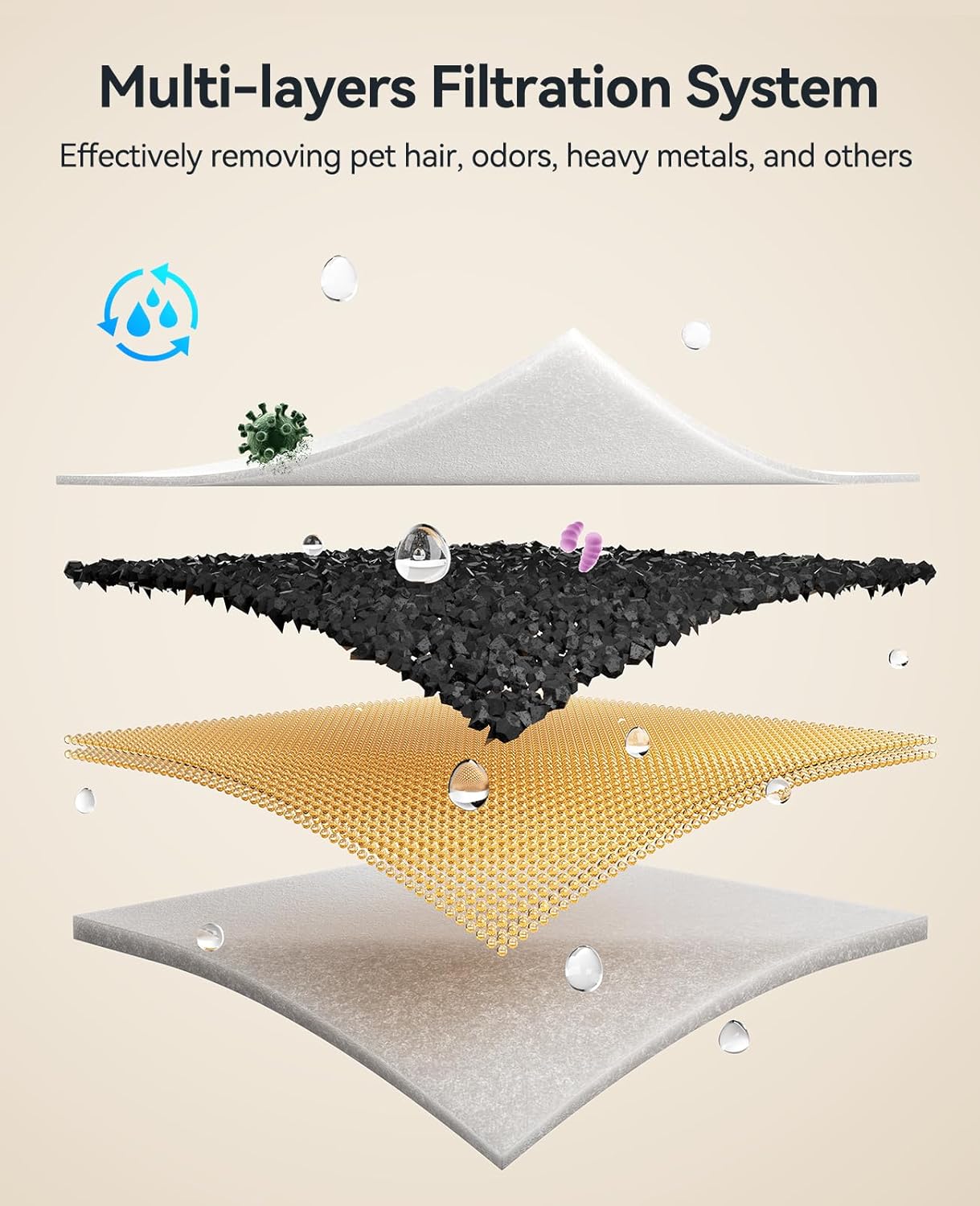 - Every Sip is Clean and Fresh: 4-layers of filter system ( high-density cotton, Ion exchange resin, coconut shell activated carbon, non-woven fabric ), keeping water cycling and being filtered