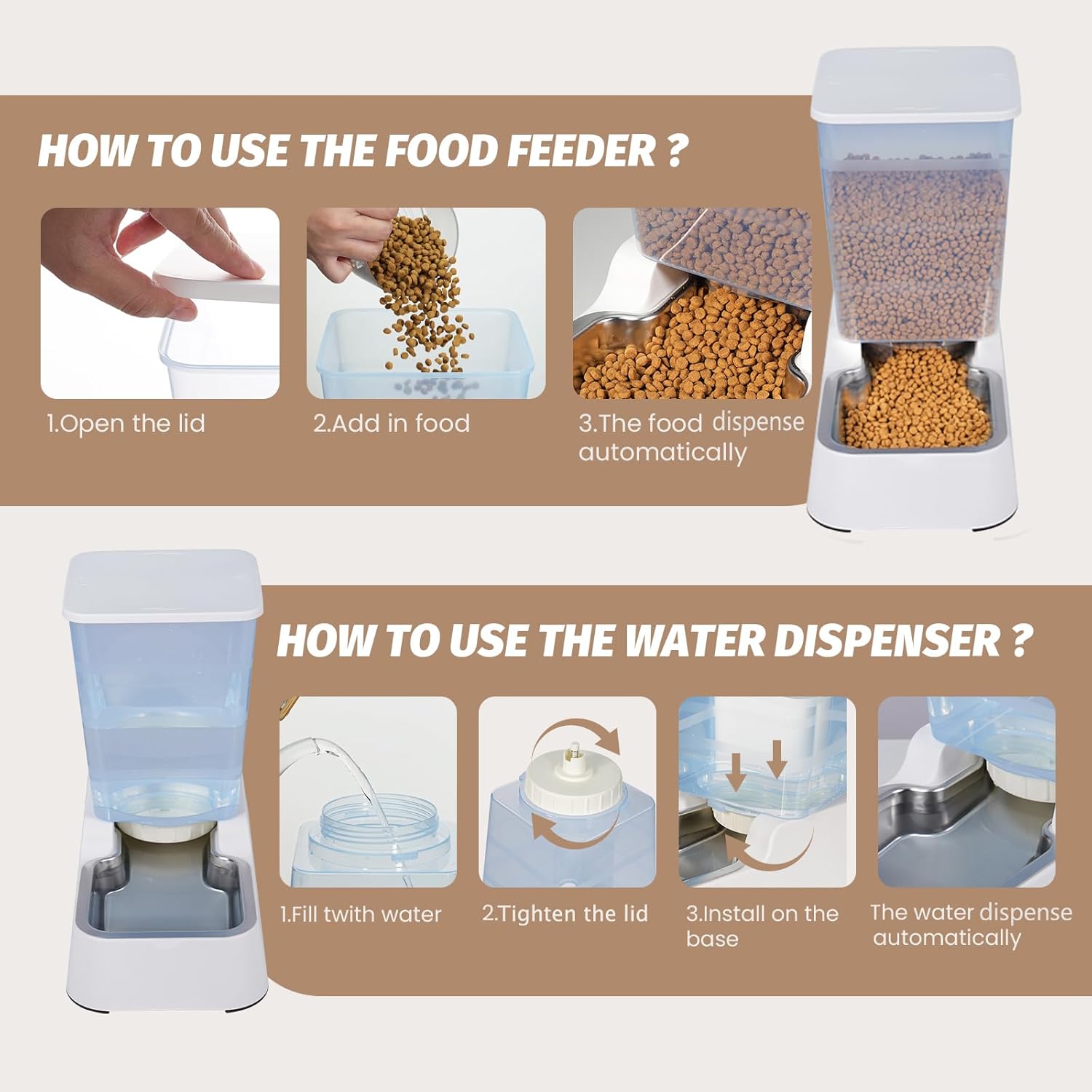 - 【Large Capacity】--- 5.4L / 1.4Gal Capacity,Works for small & medium & big -sized dogs and adult cat. It slowly refills water/food to the bowl by gravity and extends the refill time. The daily water/food supply for pets will be sustainable and very suitable for pet owners to travel or busy work.