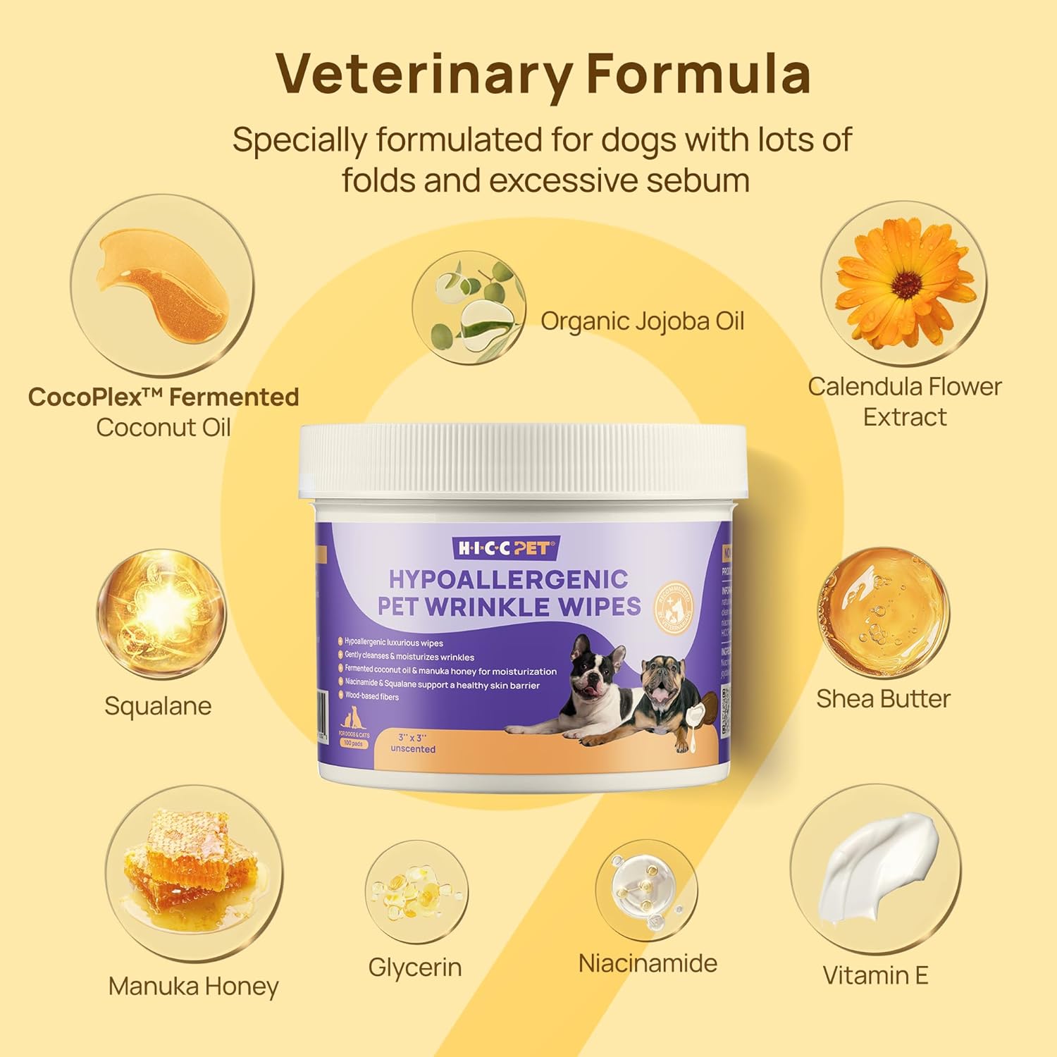 HICC PET Wrinkle Wipes, Vet-Recommended Dog Wipes Cleaning Deodorizing, Soothes Redness & Odor, Prevents Infections, Tear Stain Remover, Gentle for French Bulldogs, Pugs, English Bulldogs (100 Counts)