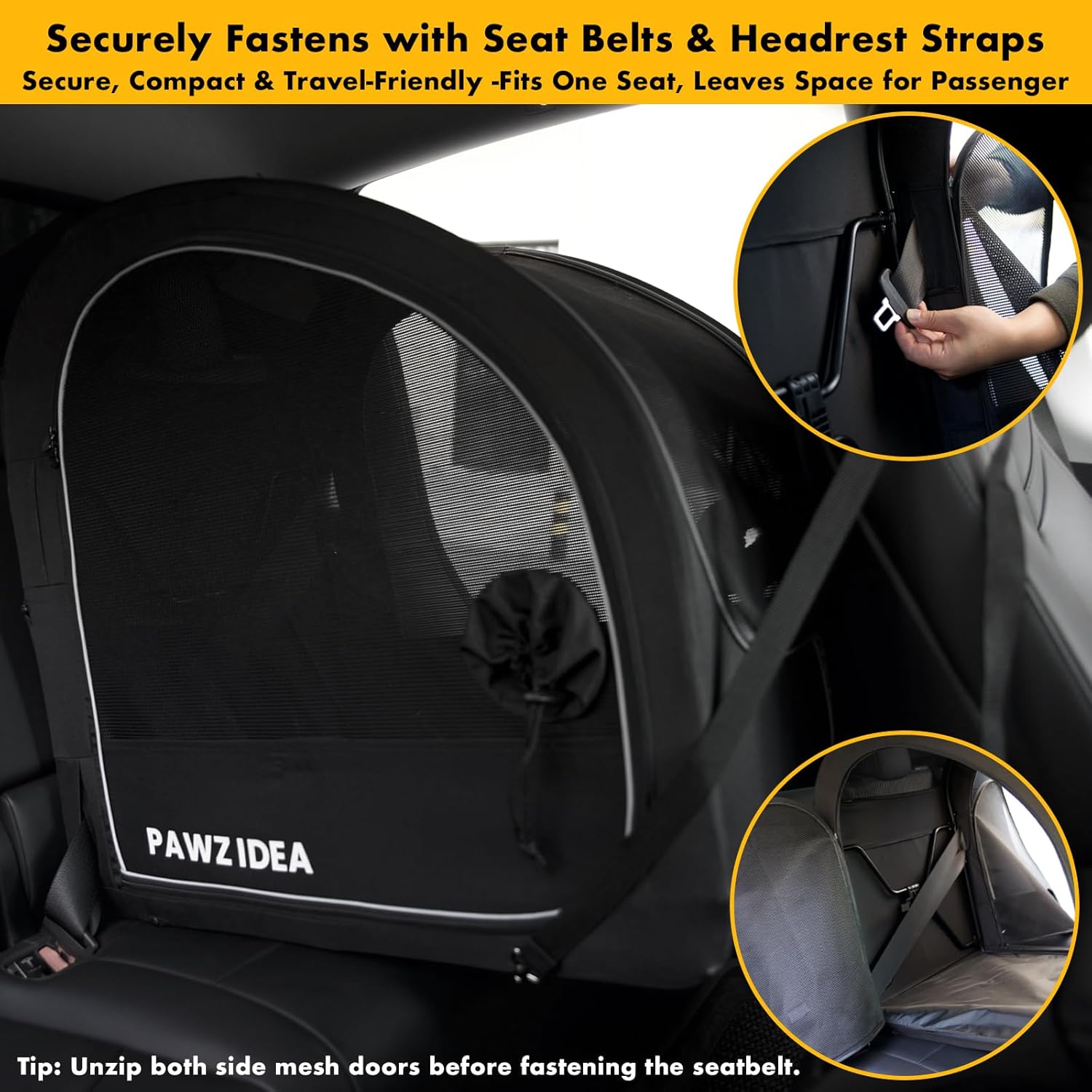 - EASY 4-STEP USE: 1️⃣ Place the machine-washable fabric cover on frame, aligning all 6 side holes. 2️⃣ Fold and expand directly on the car seat for easy entry (fits back seats >19" deep & 28" high seat-to-roof, or front passenger seats). 3️⃣ Secure with seatbelt and headrest straps for safe travel. 4️⃣ Slide the crate into stroller base slots and lock the 2 handle latches to complete setup.