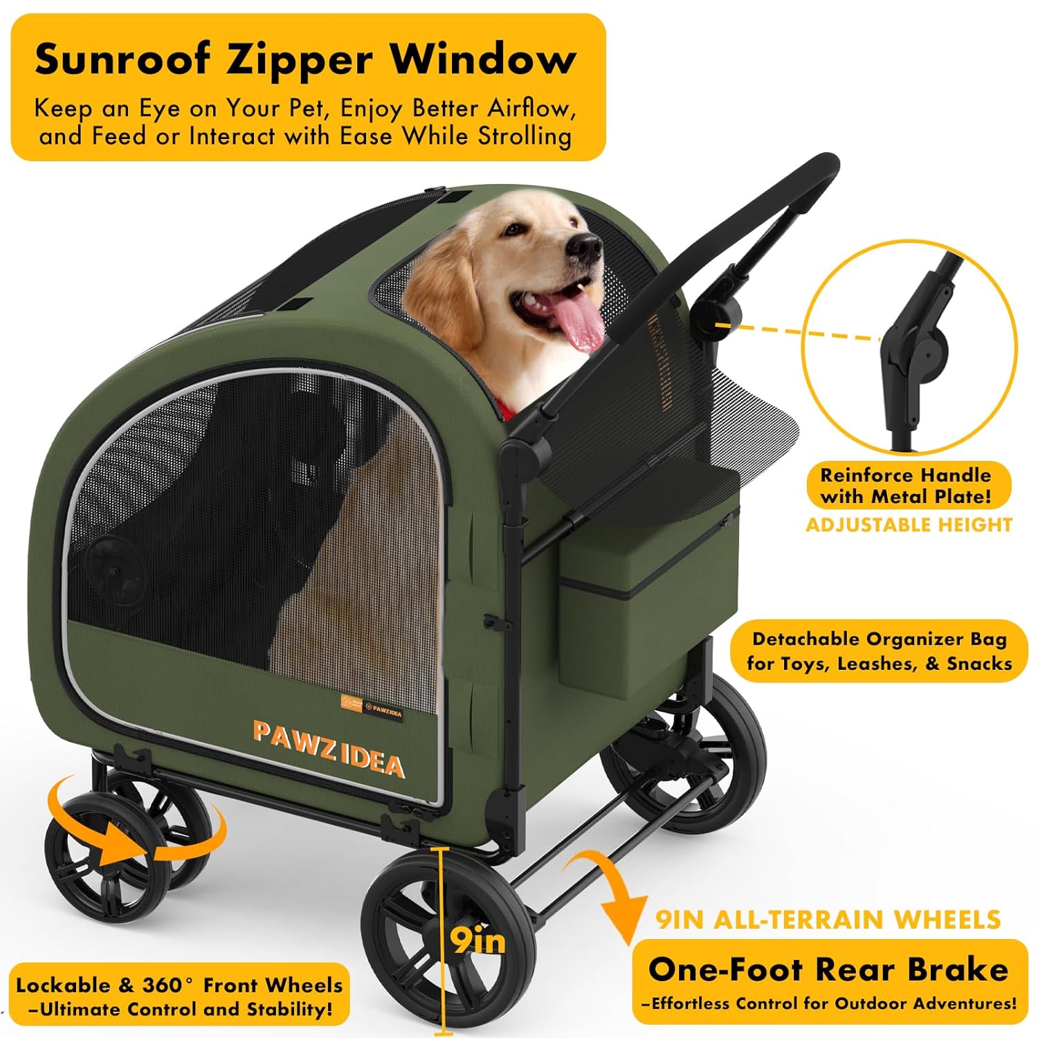 - 3-IN-1 MULTIFUNCTIONAL: PAWZIDEA large dog stroller with detachable carrier doubles as a portable car crate and a cozy, familiar indoor/outdoor dog house. Spacious 27" L x 19" W x 28" H—55% taller than standard crates, letting medium to large dogs (up to 80 lbs) sit upright and relax comfortably.