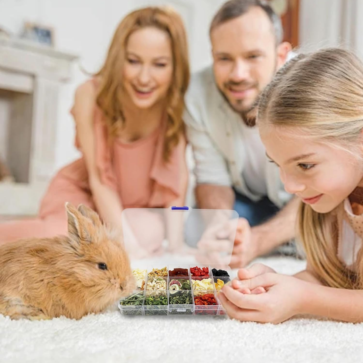 - 【Bunny Treats】: Delight your small pet with this treat box featuring 15 kinds of snacks, perfect for rabbits, hamsters, chinchillas, guinea pigs, and more. Every bite is made with care to bring joy to their day.