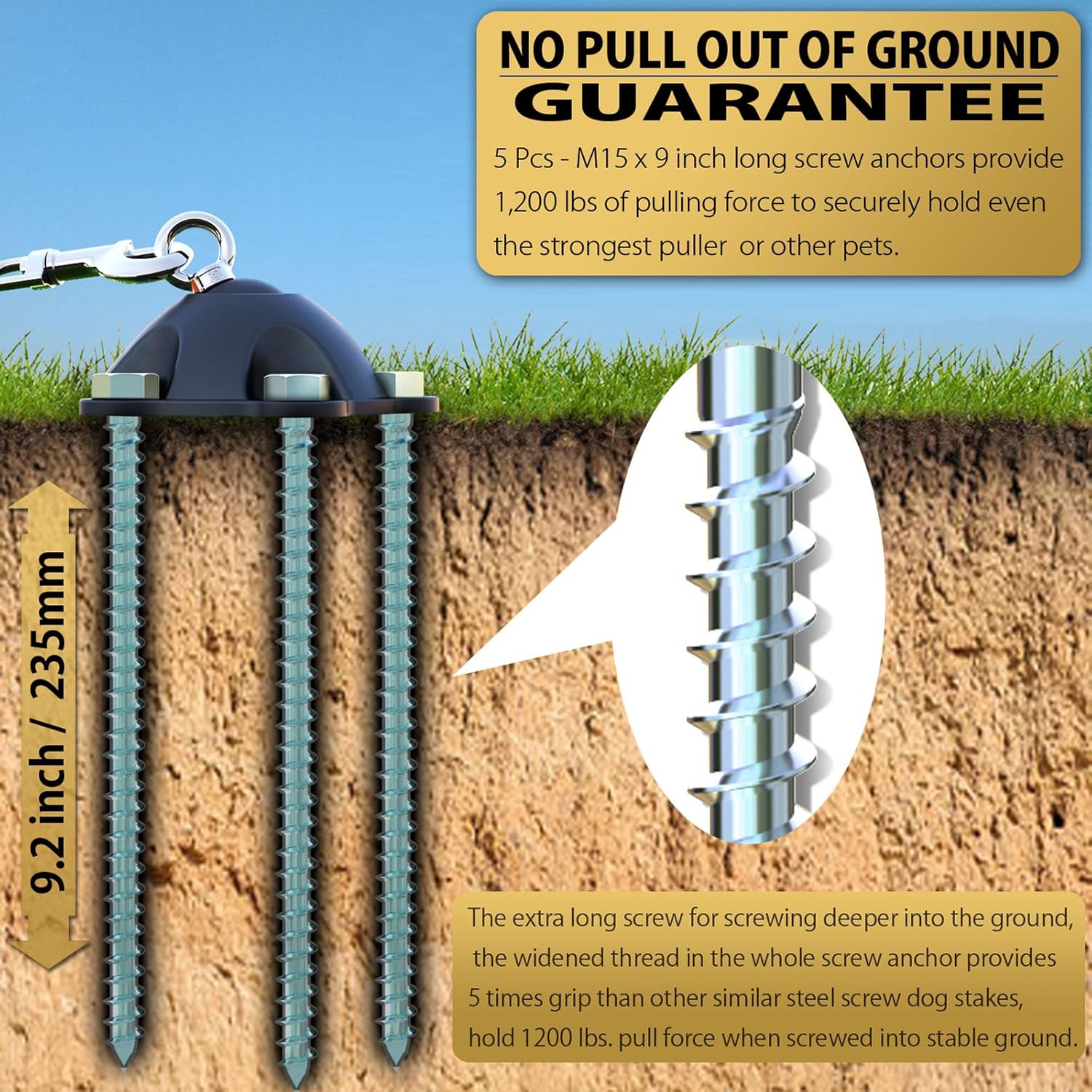- ❤ SECURE ANCHORING SYSTEM: Features 5pc metal ground anchors 2024 upgraded, made of anti-rust and tough galvanized steel, 8.5 inches long for screwing deeper into the ground, the wider thread provides 5 times grip than other similar dog stake, securely holds real 1200 lbs.of Pull Force when screwed into stable ground.