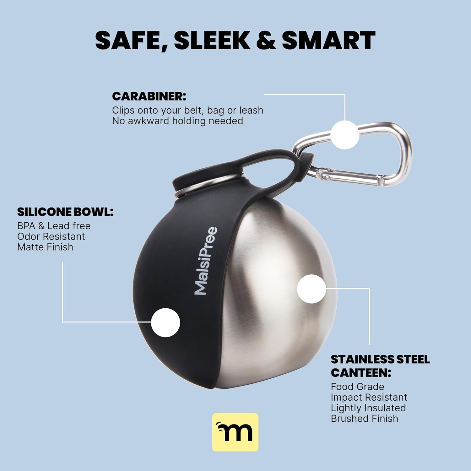 Malsipree 2-in-1 Portable Dog Water Bottle & Bowl for Small Dogs - Leak Proof & Insulating - Travel Water Dispenser - Stainless Steel Bottle & Silicone Bowl - Walking & Hiking (10 fl oz, Black)