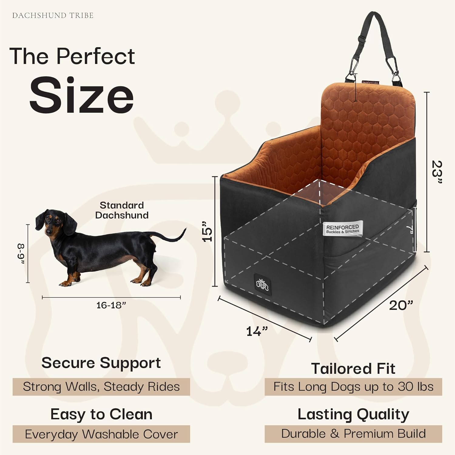 - 🌭 CUSTOM FIT FOR DACHSHUNDS: Specifically designed to accommodate the unique body shape of Dachshunds (Overall size: 20" L x 14" W x 23" H back wall), this car dog bed for small dogs has a longer seat to support their long backs and shorter sidewalls for their shorter legs. Give your Dachshund the gift of regal comfort during any car ride, offering the perfect blend of functionality and tailored design.