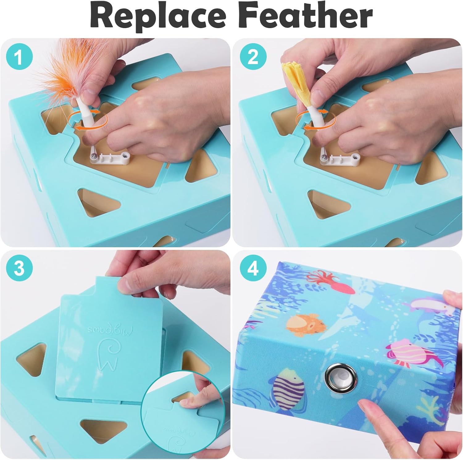 - MigiBox: Feather pops in and out randomly from 4 holes at top face and 3 holes at 3 sides of distinctive cubic architecture, encouraging cats to think, observe, and pounce. Cats become obsessed with these intelligent hunting games to relieve depression, boredom, anxiety,loneliness.