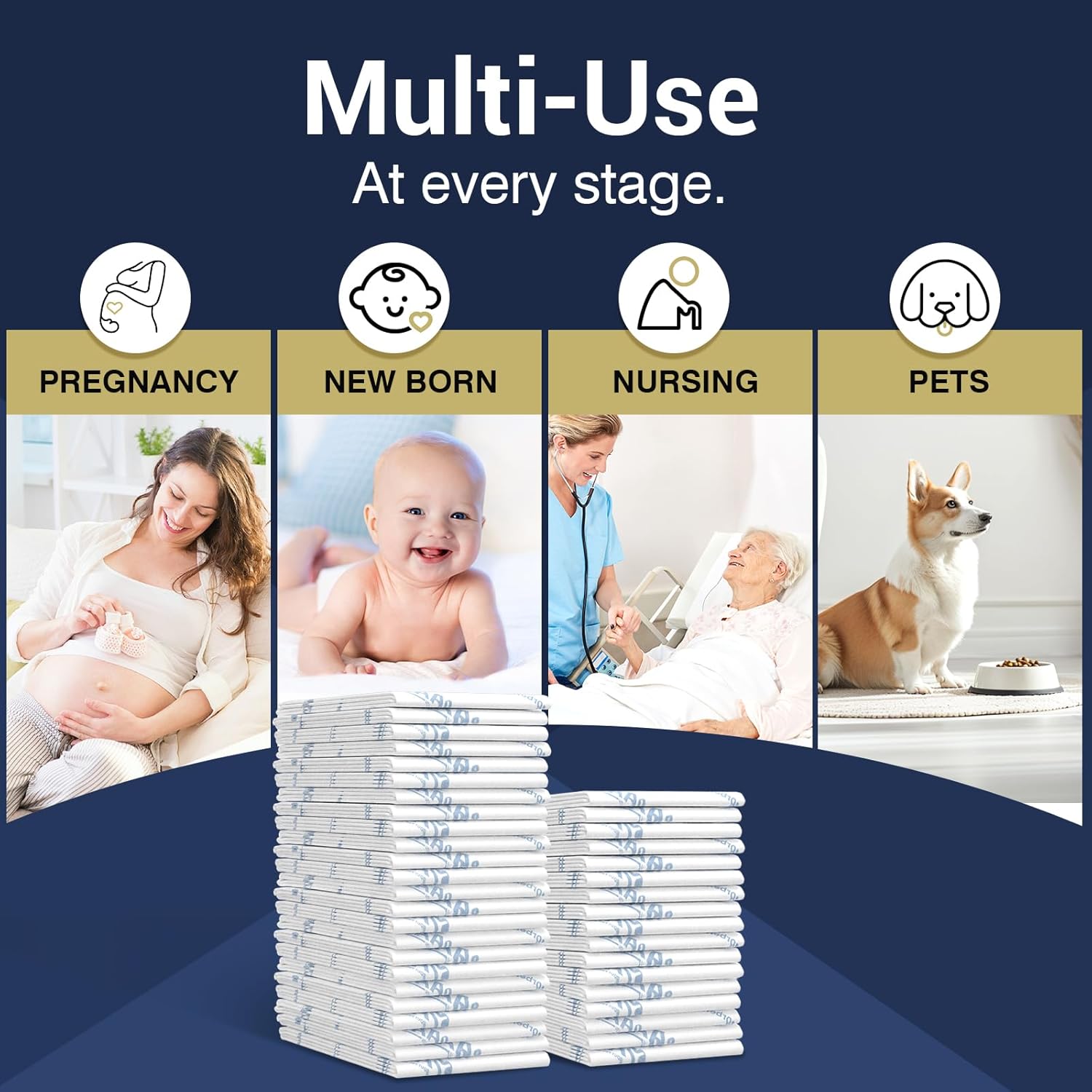 - 【UNIVERSAL MULTI-USE CONVENIENCE Versatile incontinence bed pads 36"x36" size fits beds, floors, or wheelchairs. Safe for adults, elderly, postpartum moms, puppies, and babies. Disposable design saves laundry time—ideal for homecare, or travel.