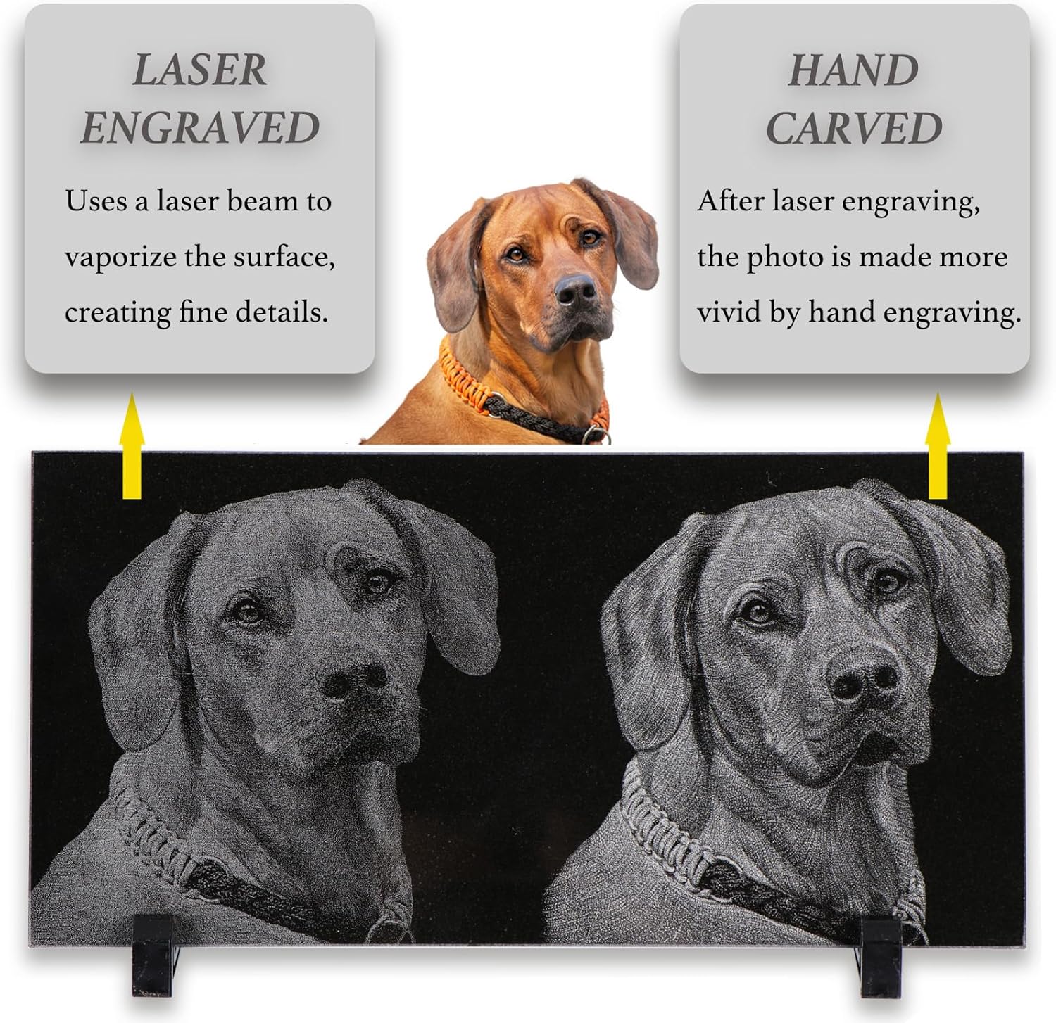 - 【 To Customize And Place An Order】: 1. Click the yellow "Customize Now " button in the upper right corner of the page. 2. Choose the size of the plaque you prefer. 3. Upload a photo (high definition) no larger than 15MB in JPEG or PNG. 4. Write down the content (any language is available) which you wish to engrave in the stone, ex: name of the pets, date of birth and passed, one touching saying you most want to say to your dog. Note: Please double check the spelling after typing. 5. Choose the font, pattern you prefer. please pay attention to Amazon email, we will send you the drawing for your review and confirmation before putting it into engraving.