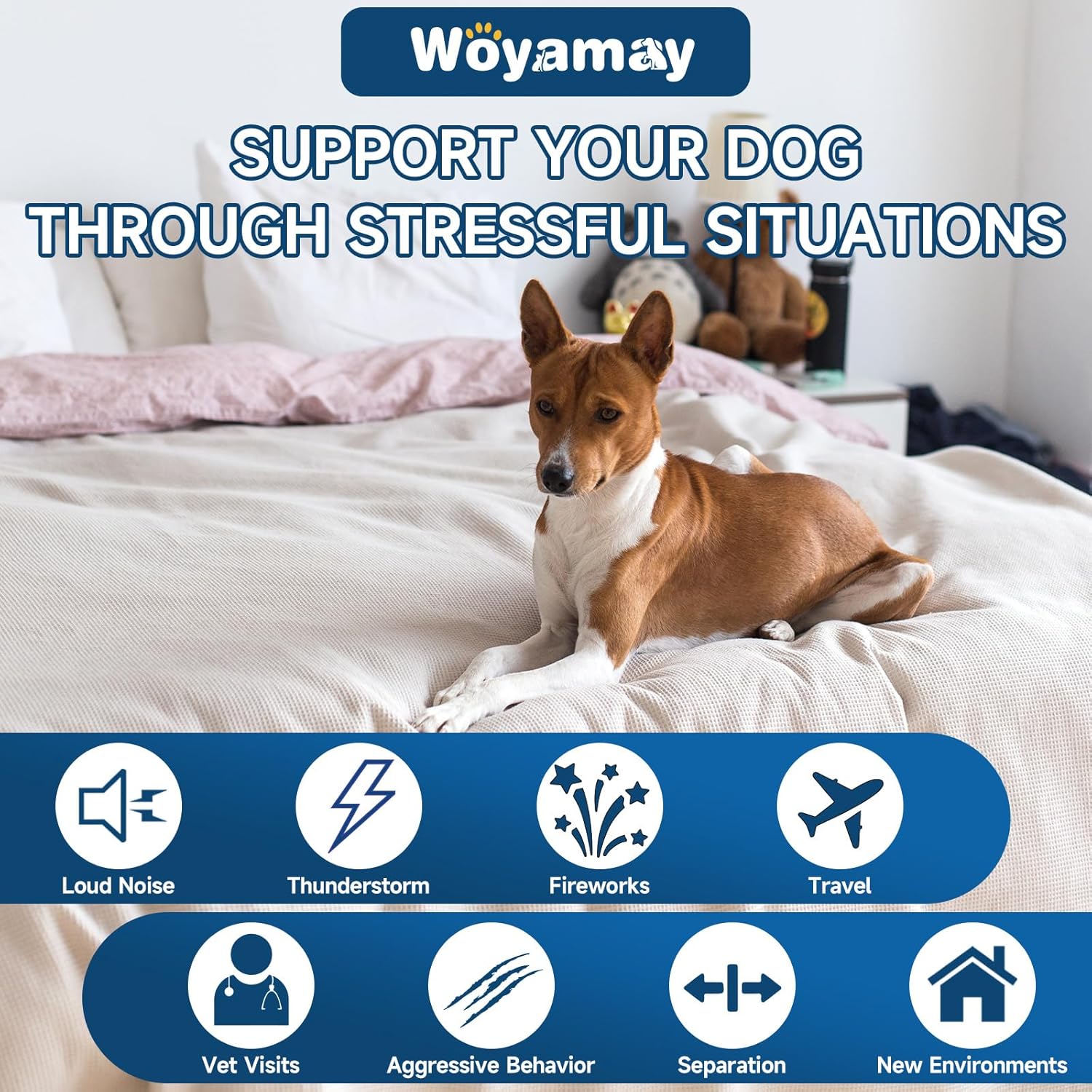 - DOG CALMING CHEWS FOR STRESS RELIEF:Woyamay 200 count calming chews for dogs help effectively and quickly reduce anxiety, soothing dogs during separation, travel, new environments, storms, or grooming. These dog calming treats support relaxation and maintain normal stress levels, helping your dog feel calm, happy, and comfortable while improving sleep quality