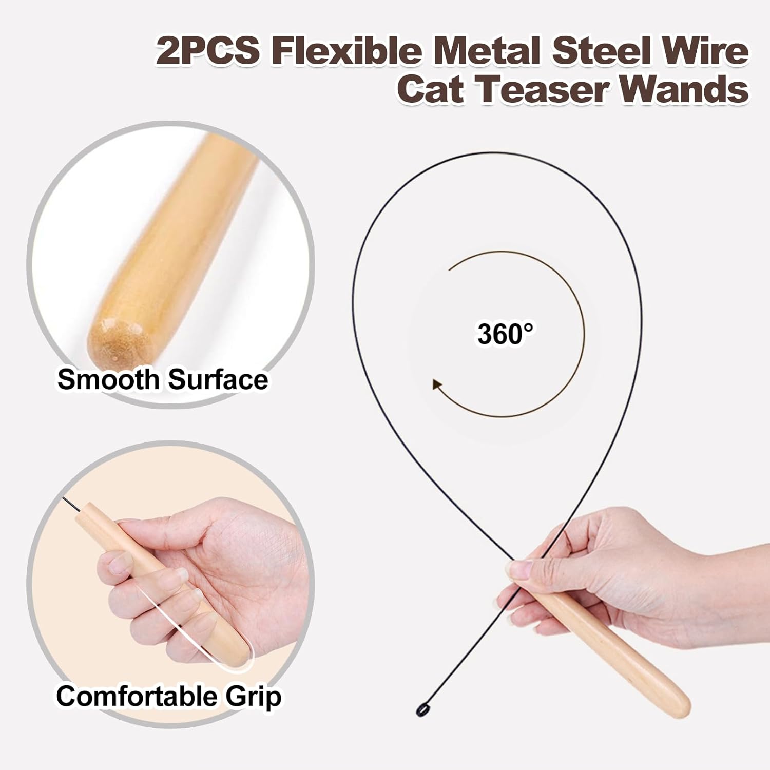 - 【Two Flexible Steel Wire Cat Teaser Wands】The cat toy wands are made of elastic stainless steel with a natural wooden handle, this will be more sturdy and comfortable for use, total length is 35 in. The steel wire has excellent elasticity and is easy to control, it will make the feathers move more flexibly and with greater amplitude, which can make it more fun for the cat to "hunt".