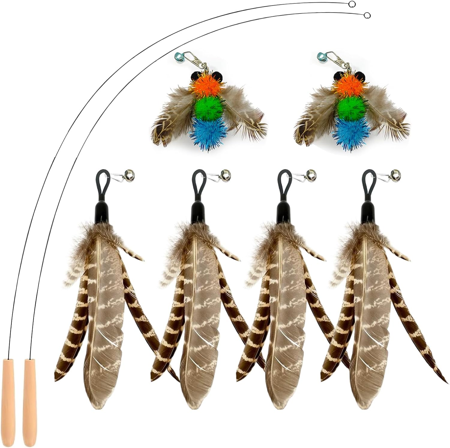 - 【6PCS Feathers & Insects Replacement Accessories】Our cat wand toys set comes with 6 feather refills: 2pcs simulated moths feather replacements and 4pcs long feathers replacements. Our feather refills are made of natural feathers, making them safe for cats to play with.