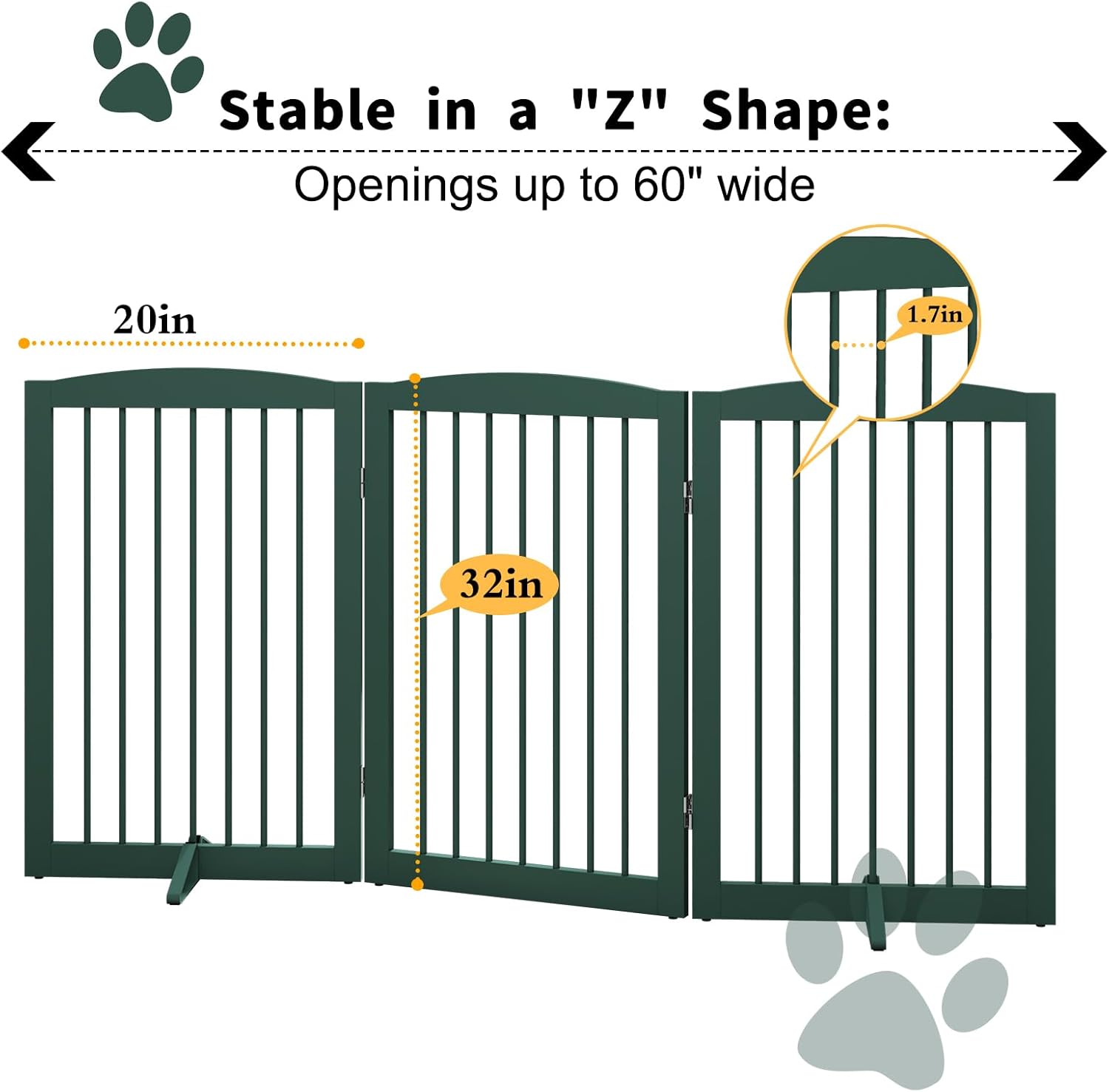 Freestanding Pet Gate for Dogs, Foldable Wooden Dog Gate for House Indoor, Step Over Pet Puppy Safety Fence for Stair, Doorway,Hall, Support Feet Included,3 Panels 32",Green