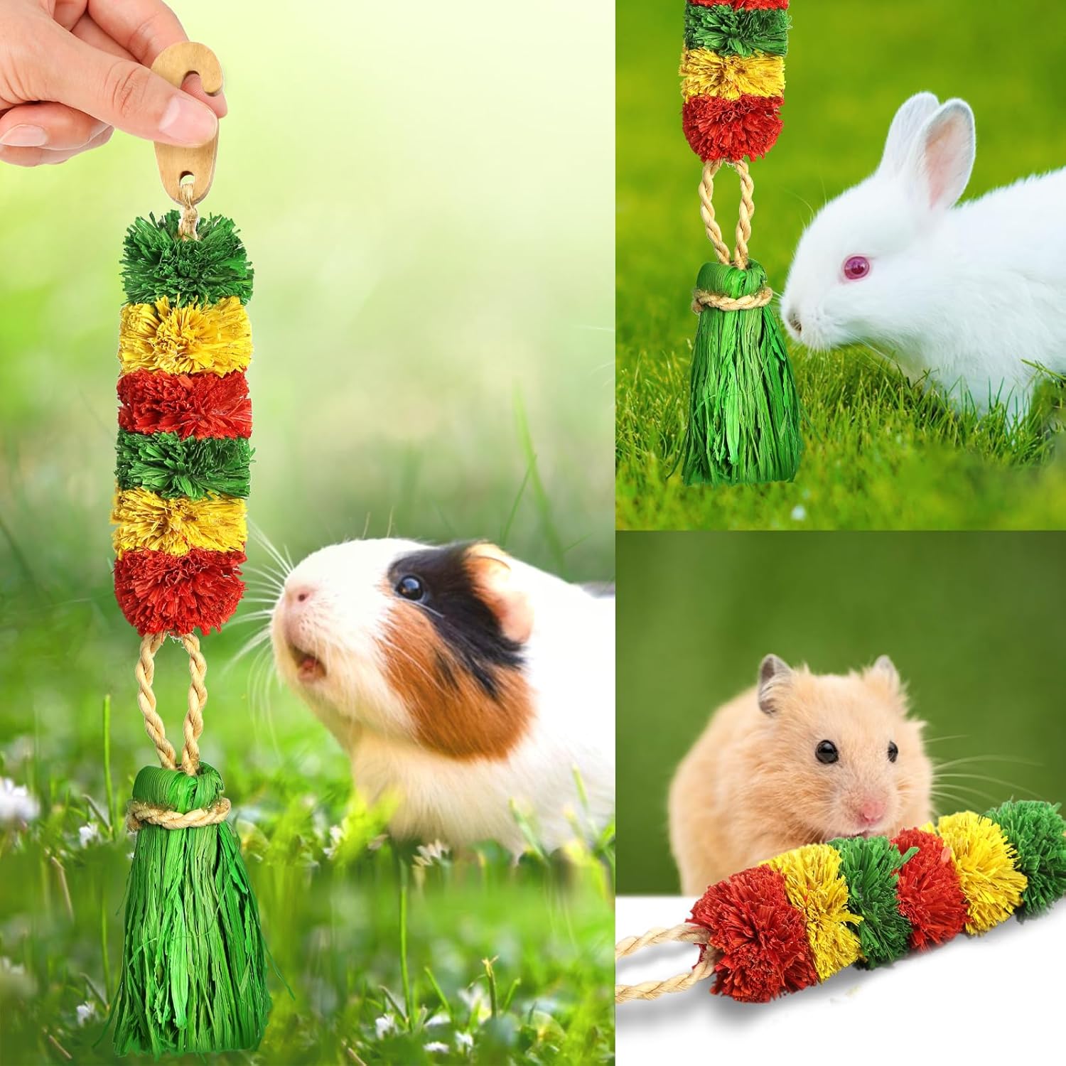 - Hanging Rabbit Toys: Crafted from organic corn leaf, natural wood and rattan, this hanging chew toys or treat fits in rabbit cage. It functions as rabbit chew toys and provides safe nibbling options
