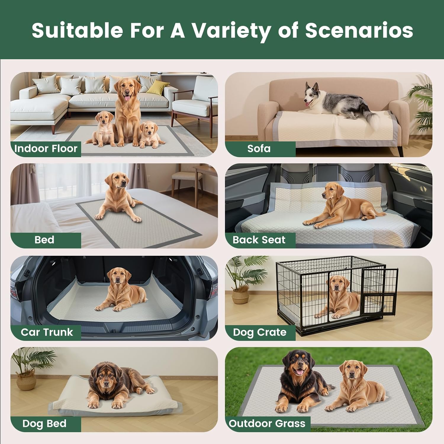 - MULTIPURPOSE: This xl pee pad is very versatile, it can be dog training pads, pet pee pads for cats, dog incontinence pads for senior pets and post-partum care pads. This dog wee wee pads suits for cars, puppy trays, playpens, dog crate, cat crate, and covering spills from water/food bowls. This puppy training pads is perfect for traveling, outdoors, in hotels, public areas and daily walks. This training pads for dogs xl can meet almost all pets' needs, as large puppy pads, doggy pads, cat pads, senior dogs, kittens, rabbits, ducks pads and so on.