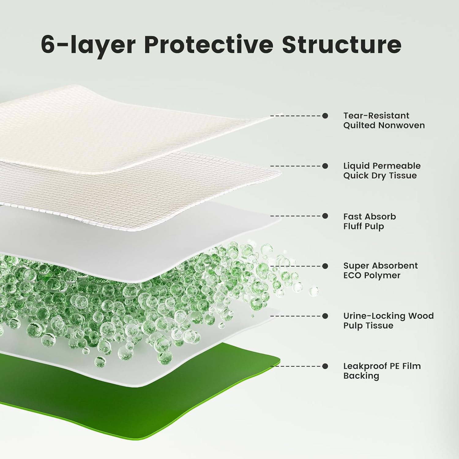 - SUPER ABSORBENT: The dog pee pads extra large are made with a 6-layer layered core pad and the thickness of the pads has been increased, which greatly enhances the water absorption capacity. The thickened heavy duty PE waterproof membrane on the back is tear-proof, which can prevents liquid from penetrating into the floor or carpet. This is especially useful pet supplies for training puppies, as puppies may go to the toilet frequently in the early stages of training, this xxl puppy pads can provide extra protection.