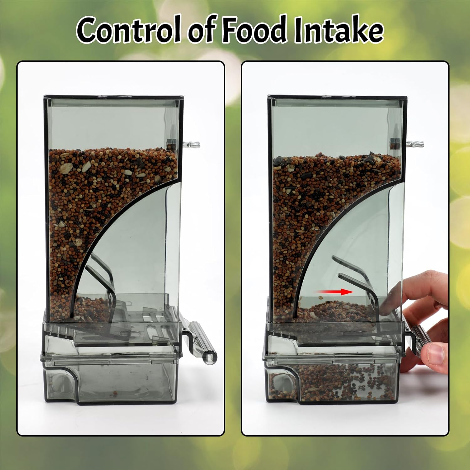 - Note: The transparent bird feeder adjusts the amount of grain according to your bird's eating habits, preventing it from being overfed or underfed; The feeder has a 3.9 inches x 3.3 inches feeding opening that needs to go through the cage when in use, so the opening size of the cage needs to be slightly larger than the feeding opening size to prevent the feeder from not being able to be mounted on the cage
