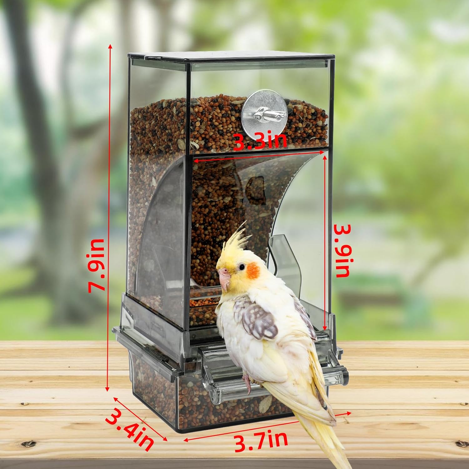 - Large capacity: The automatic parrot feeder measures 7.9 inches x 3.7 inches x 3.4 inches, it can hold about 450g of food, which is enough to satisfy your little bird's food needs for 15 days; You can go out without worrying about your pet going hungry; Perfect for parrots, starlings, grackles, lovebirds, canaries, parakeets and other small to medium sized birds