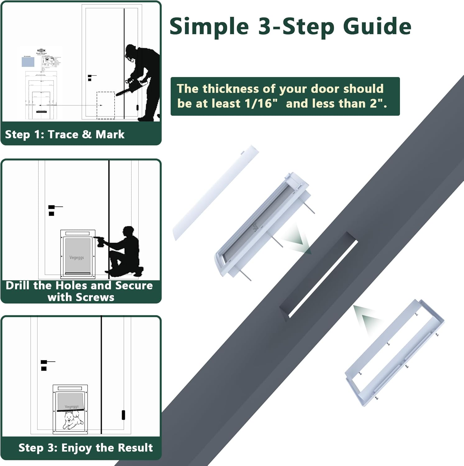 - EASY INSTALLATION AND CONVENIENCE: The pet door is easy to install and can be done by yourself. It can be easily installed on wooden doors, PVC doors and metal doors in 2 inch thickness, and suitable walls in 2 inch thickness, allowing your pets to freely enter and exit without your assistance.