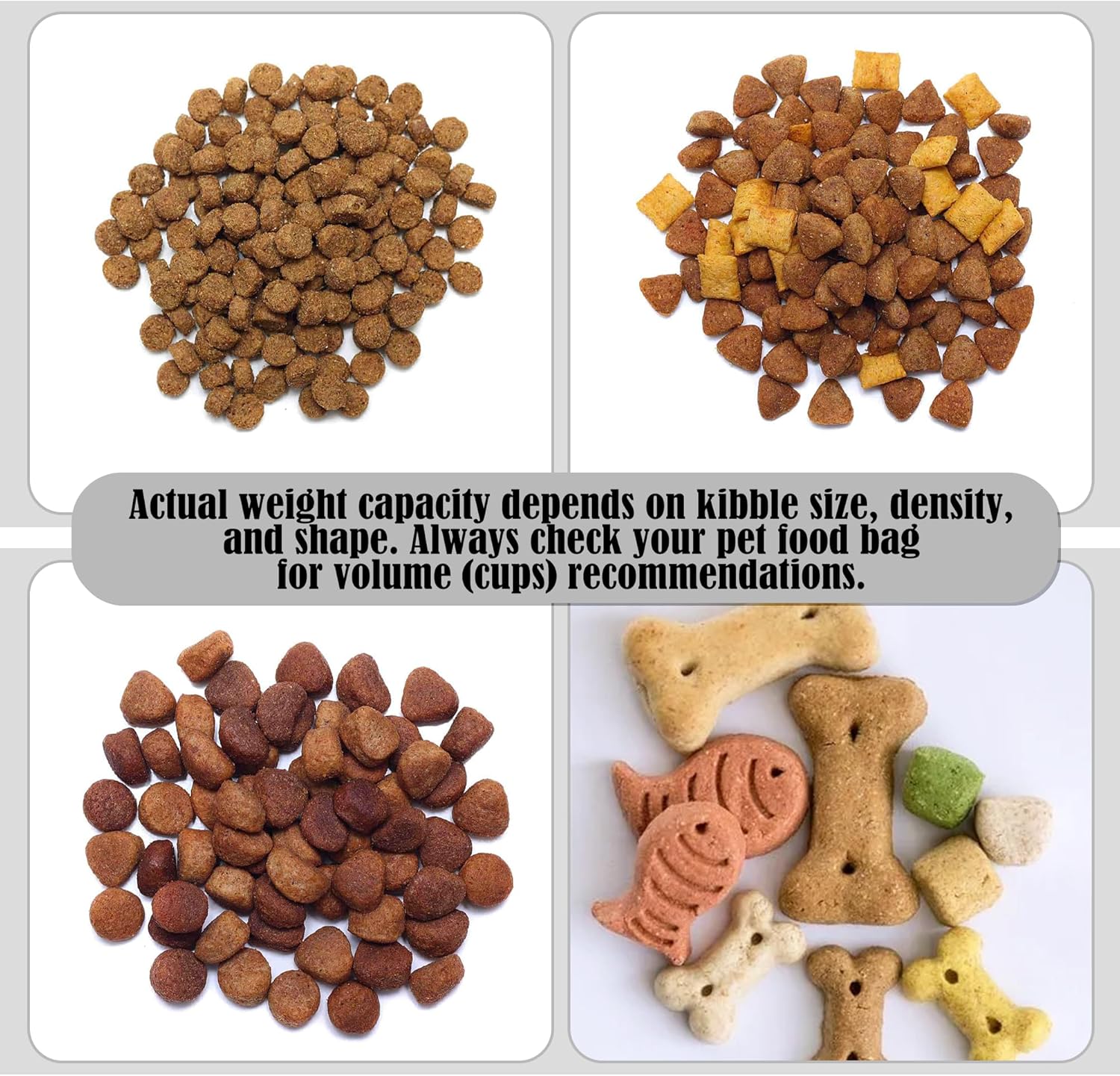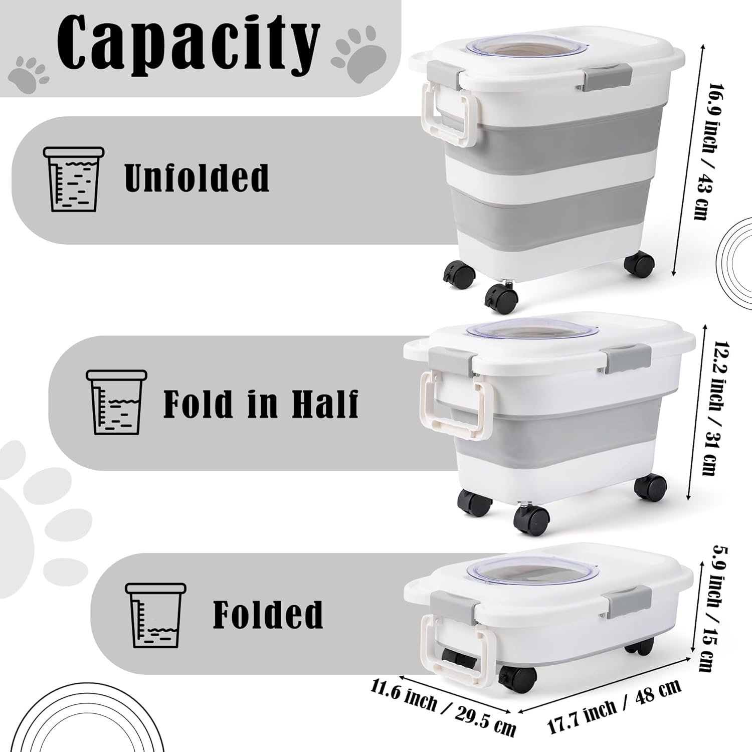 - Triple Folding Design: The pet food organizer is designed with a sturdy 3-tier silicone construction that can be easily changed at any time to meet your food storage needs. The first tier is 5.9 inches tall, the second tier is 12.2 inches tall, and the third tier is 16.9 inches tall. The actual load-bearing capacity depends on the size, density, and shape of the particles of the material.
