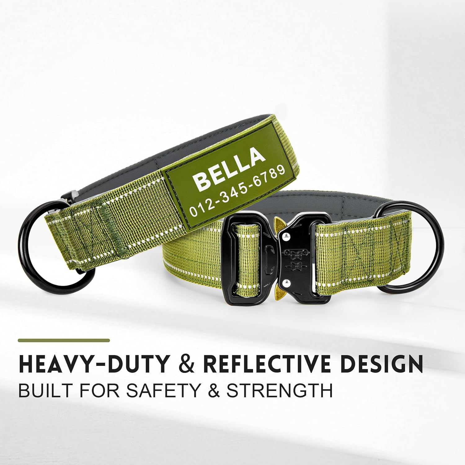Personalized Tactical Dog Collar with Soft Padding & Reflective Strips for Large Dogs, Heavy Duty Nylon with Metal Buckle, Custom Name, Durable, Available in Pink, Blue, Black, Green