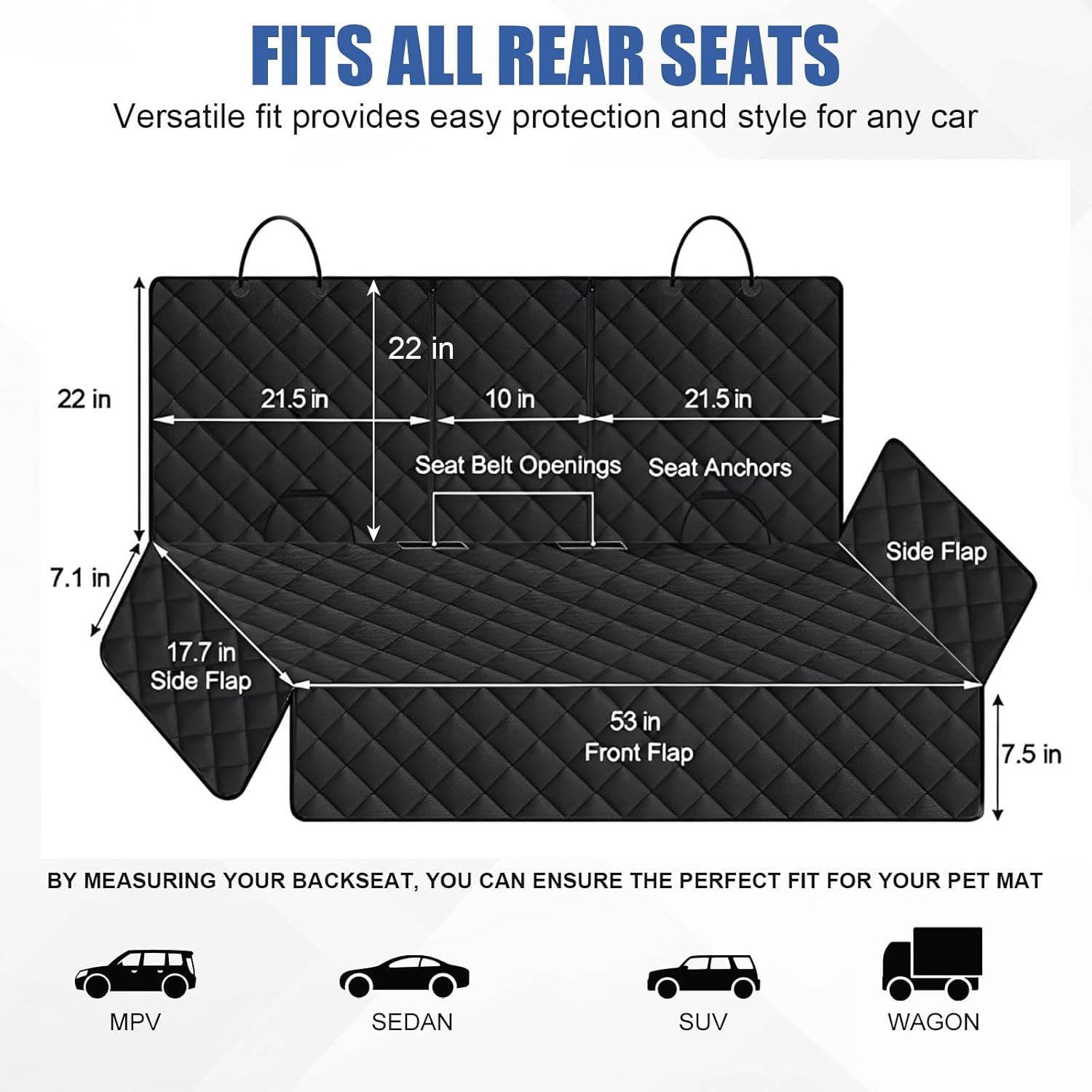 - FITS ALL REAR SEATS: The Dog Car Rear Seat Cover fits most cars and SUVs. It is oversized with front and side flaps to provide full coverage, ensuring your seats stay clean and preventing dog hair from falling off