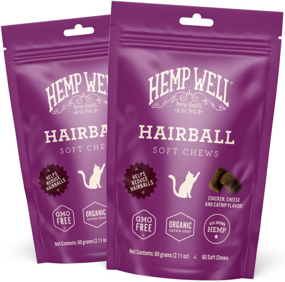 Hemp Well Cat Hairball Soft Chews for Cats (2 Pack), Organic USA Grown, Chicken Cheese & Catnip Flavor!