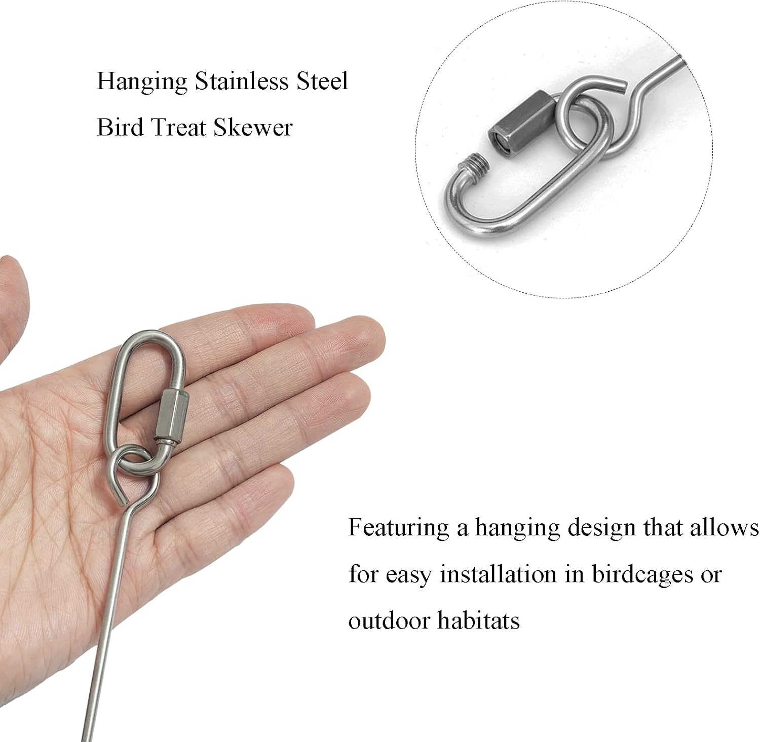 - Size and Quantity: The set contains 2 stainless steel bird treat holders, the total length of each is 15 cm. You can use the this parakeet treat skewer holder to pierce fruits and vegetables like apple chunk, baby carrot, or other snack. Suitable for parrot, parakeet, conure, lovebird, cockatoo, budgie, cockatiel, macaw and other small caged animals