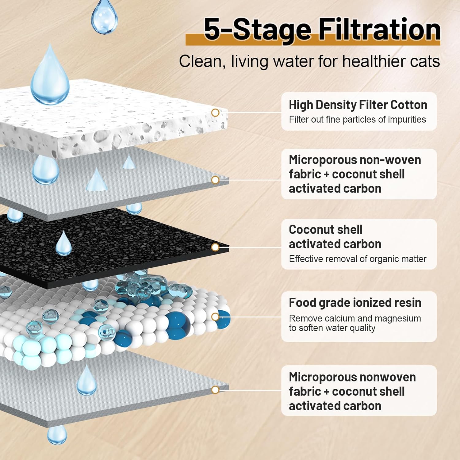 - 5-layer Filtered Water is Healthier: The cat fountain uses a 5-layer filter, which increases the use of filtering materials. The circulating filtration system can provide pure and fresh water for your pets. This means that you can provide your cats with safer and more hygienic drinking water options, which can help protect their health and reduce health problems caused by water quality issues.