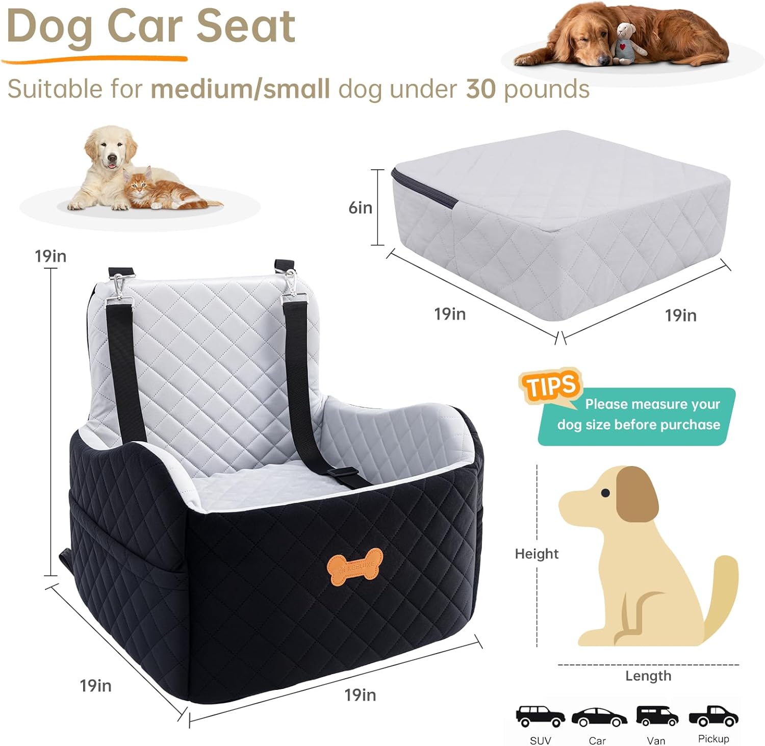 - SMALL SIZE DOG CAR SEAT: This dog car seat measures 19"(L) x 19"(W) x 19"(H), providing ample space for medium or small dogs up to 30 pounds. The dog car seat is suitable for almost all types of vehicles, such as cars, trucks, and SUV, and you can easily install them in the back or passenger seat.