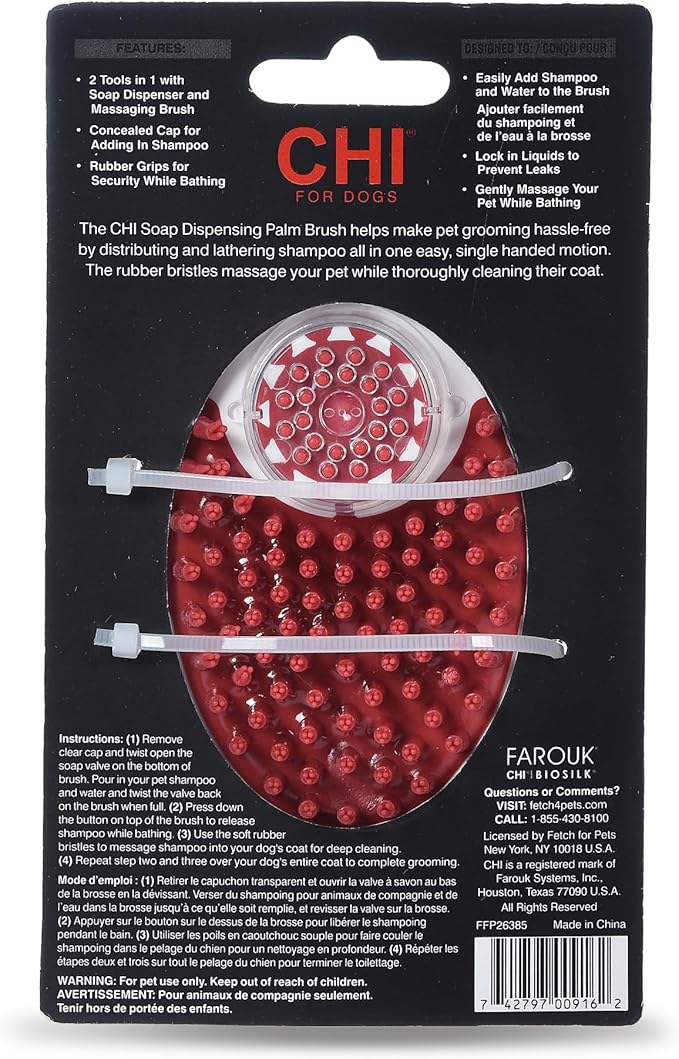 CHI for Dogs Soap Dispensing Palm Brush - Handheld Dog Grooming Tool with Built-in Soap Dispenser - Easy-to-Use Dog Brush for Bathing and Massaging Coats - Gentle on Skin