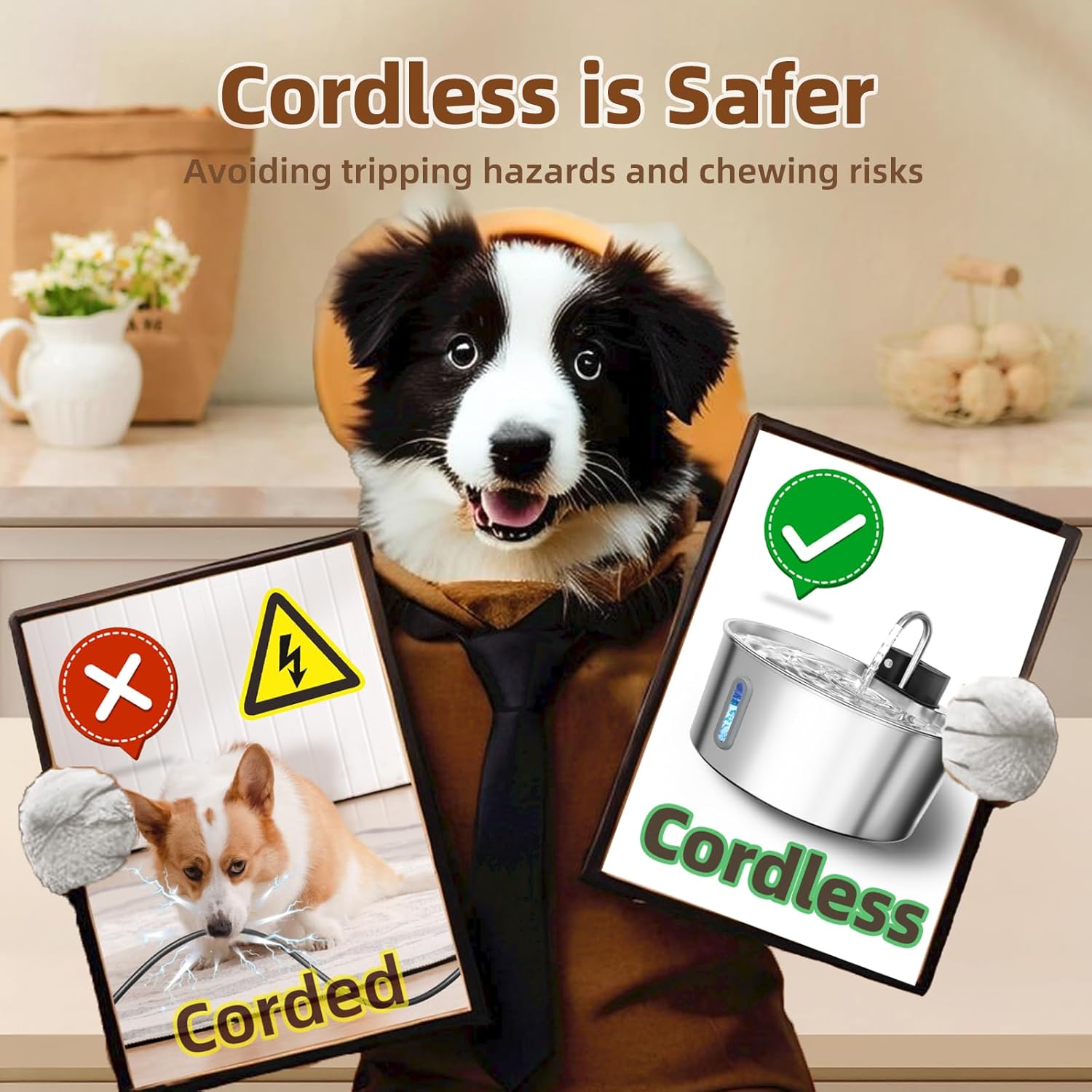 - 【Cordless & Wireless Design, Perfect for Indoor and Outdoor Use】 Free your pet's drinking experience from the constraints of wires with this truly cordless dog water fountain and wireless cat water fountain. Designed for ultimate portability, it can be placed anywhere—indoors or outdoors—such as the living room, bedroom, kitchen, garden, or patio. The absence of cables ensures a pet-safe environment by preventing chewing, making it ideal for curious pets.