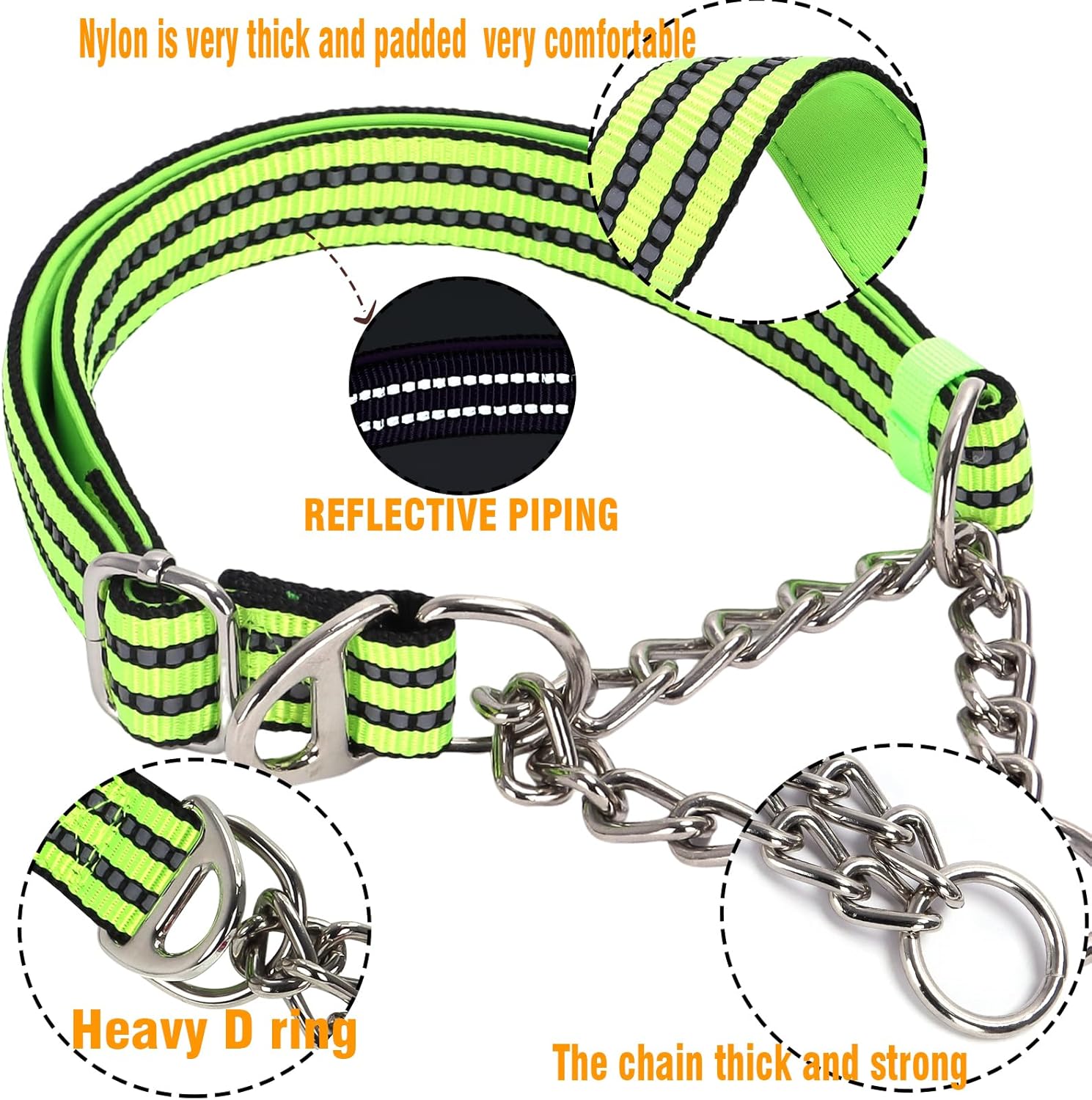 - MARTINGALE STYLE COLLARS - A comfortable alternative to a choke collar, with a heavy - duty stainless steel chain. When the dog pulls, it creates tension for better control. It slips over the dog's head for quick out - door. Make every walk safer and more enjoyable for your dog with our Reflective Martingale Collar – the perfect blend of safety, comfort, and durability! Recommended by trainers, it's safe and effective for reducing pulling and training.