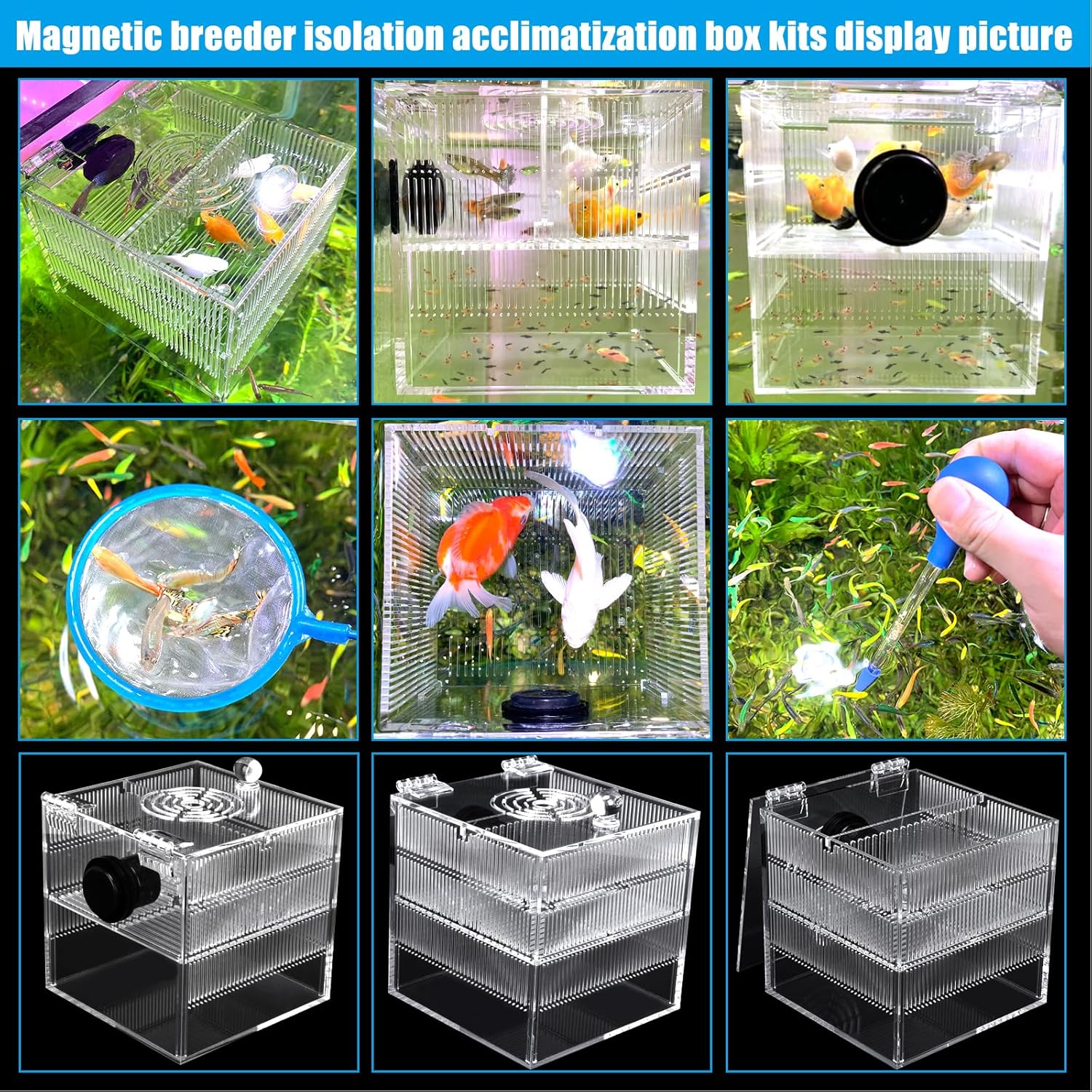 - 【Aquarium baby fish breeder box for fish tank product kits list】1pcs 4.72 Inch*4.72 Inch*4.72 Inch High Quality acrylic magnetic fish tank aquarium breeder box with 3pcs Freely Assembled Isolation board(The main boby of fish breeding hatchery box is molded in one piece and you do not need to assemble the main body of the breeder box), 1pcs 7.6 Inch Guppy Baby Fry Net, 1pcs 8 Inch Fish Feeder