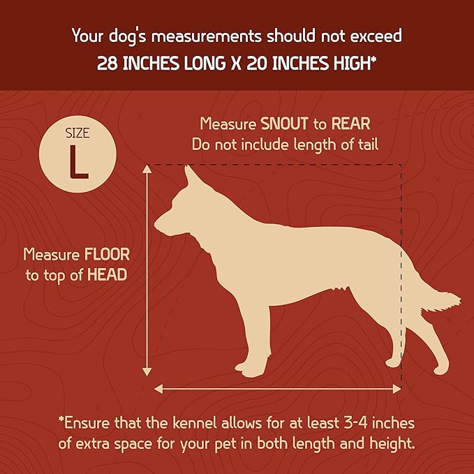 - Your dog’s measurements should be under 29” L x 20” H for large kennel - 2 dishes and 4 live animal stickers metal bolt and nuts included